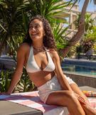 Ajoutez une subtile touche bohème à vos looks de plage avec ce haut de maillot de bain triangle. Un soutien-gorge de bain femme recouvert d’une maille ajourée avec des motifs en relief ton sur ton et une élégante perle à l'entrebonnet. Le haut de maillot possède des coussinets amovibles permettant d’accentuer légèrement le volume de la poitrine. Il est doté de bretelles à nouer dans le cou et d'un lien à nouer autour du buste. Ce maillot de bain triangle se porte avec le slip de bain assorti pour une silhouette complète.