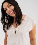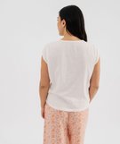 Craquez pour ce haut de pyjama idéal pour les beaux jours ! Un tee-shirt sans manches avec fronces sur l’avant et l’arrière des épaules et un col V avec petite ouverture goutte et liens à nouer. Le t-shirt de pyjama femme affiche une coupe large pour vous offrir un maximum de confort. À porter avec un bas de pyjama court ou long en fonction des envies.