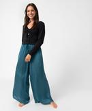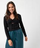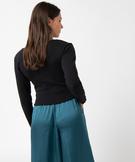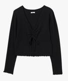 Ce tee-shirt en maille côtelée apportera une belle touche de fantaisie dans le dressing homewear avec ses finitions froncées dans le bas et aux poignets. Un haut de pyjama femme ultra sexy avec sa coupe courte, son large col V qui se prolonge par une partie froncée avec un lien ajustable sur l’avant et une ouverture juste sous le décolleté. Un tee-shirt d'intérieur à porter en soirée avec une jupe droite ou un pantalon en toile.