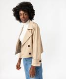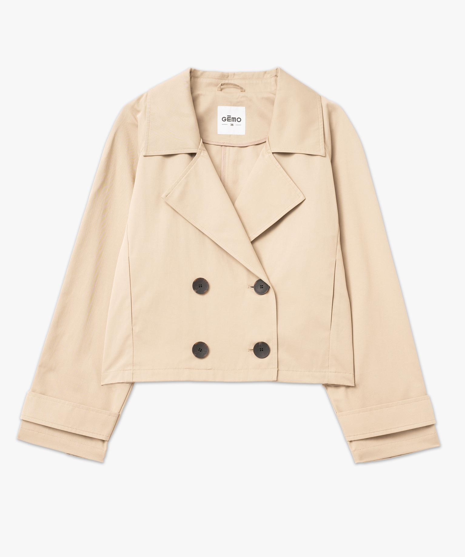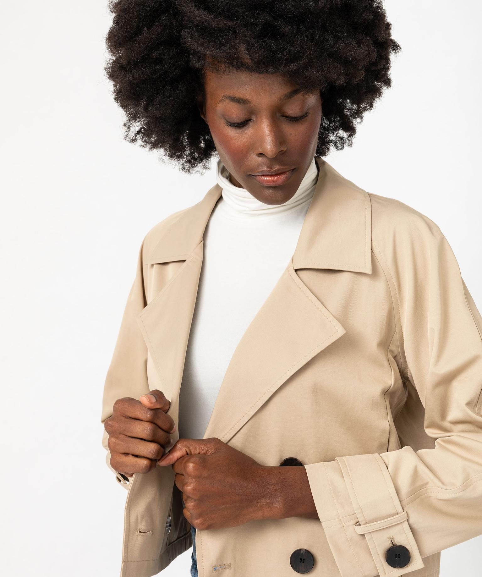 Cette saison, laissez-vous surprendre par l’imperméable dans une version courte pour coller à la tendance crop top ! Ce trench femme est confectionné dans une toile satinée avec un grand col tailleur, d'élégants boutons XXL avec fermeture croisée, pattes boutonnées aux poignets et emmanchures raglan. Cette veste courte possède également des poches dissimulées dans les coutures. Elle se porte idéalement avec un pantalon taille haute. Sans doublure, finition biais.