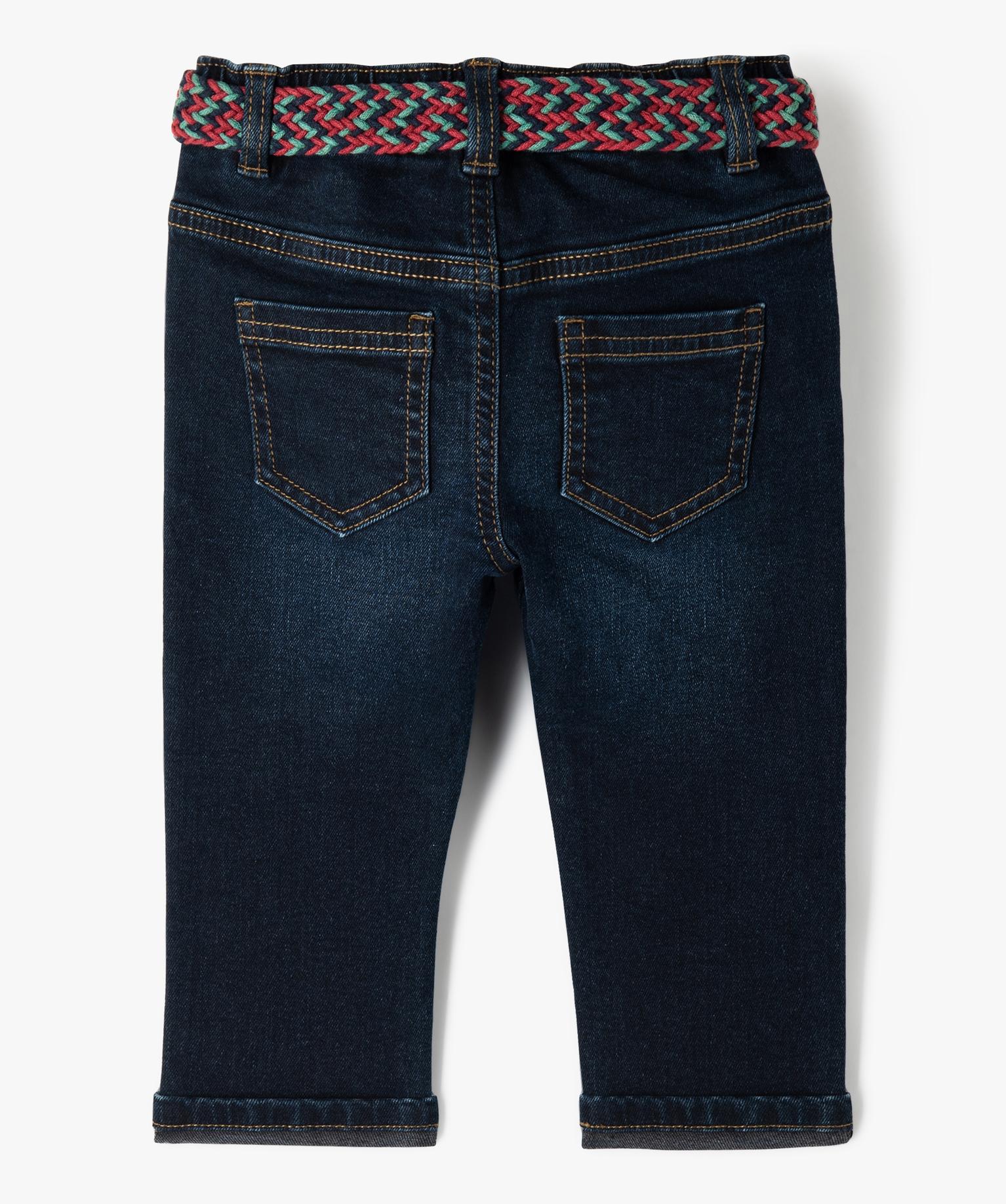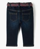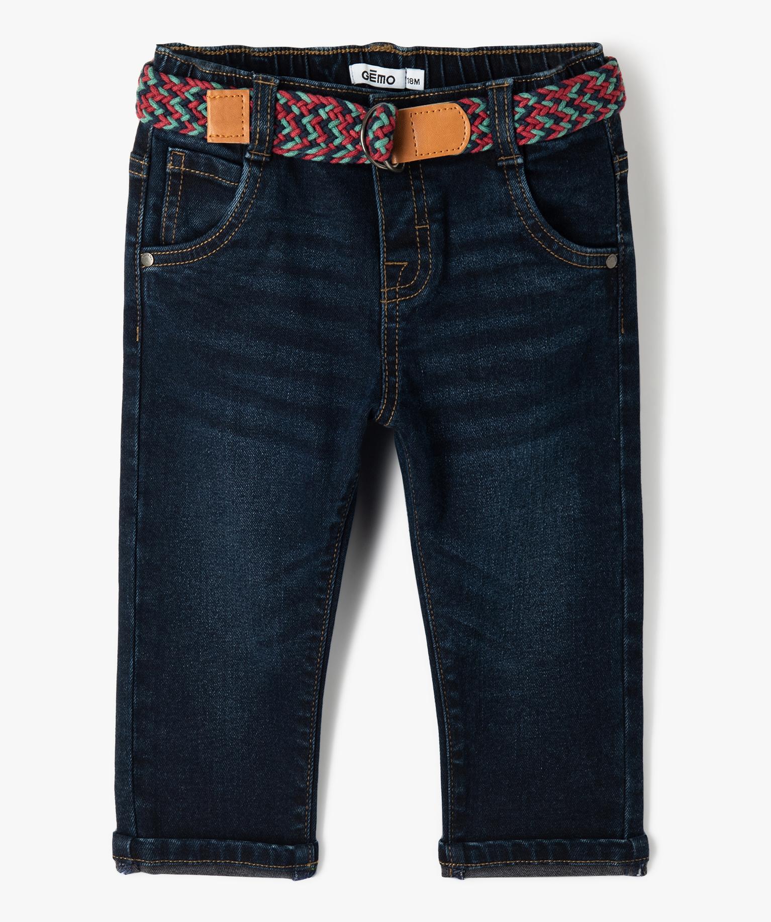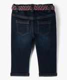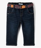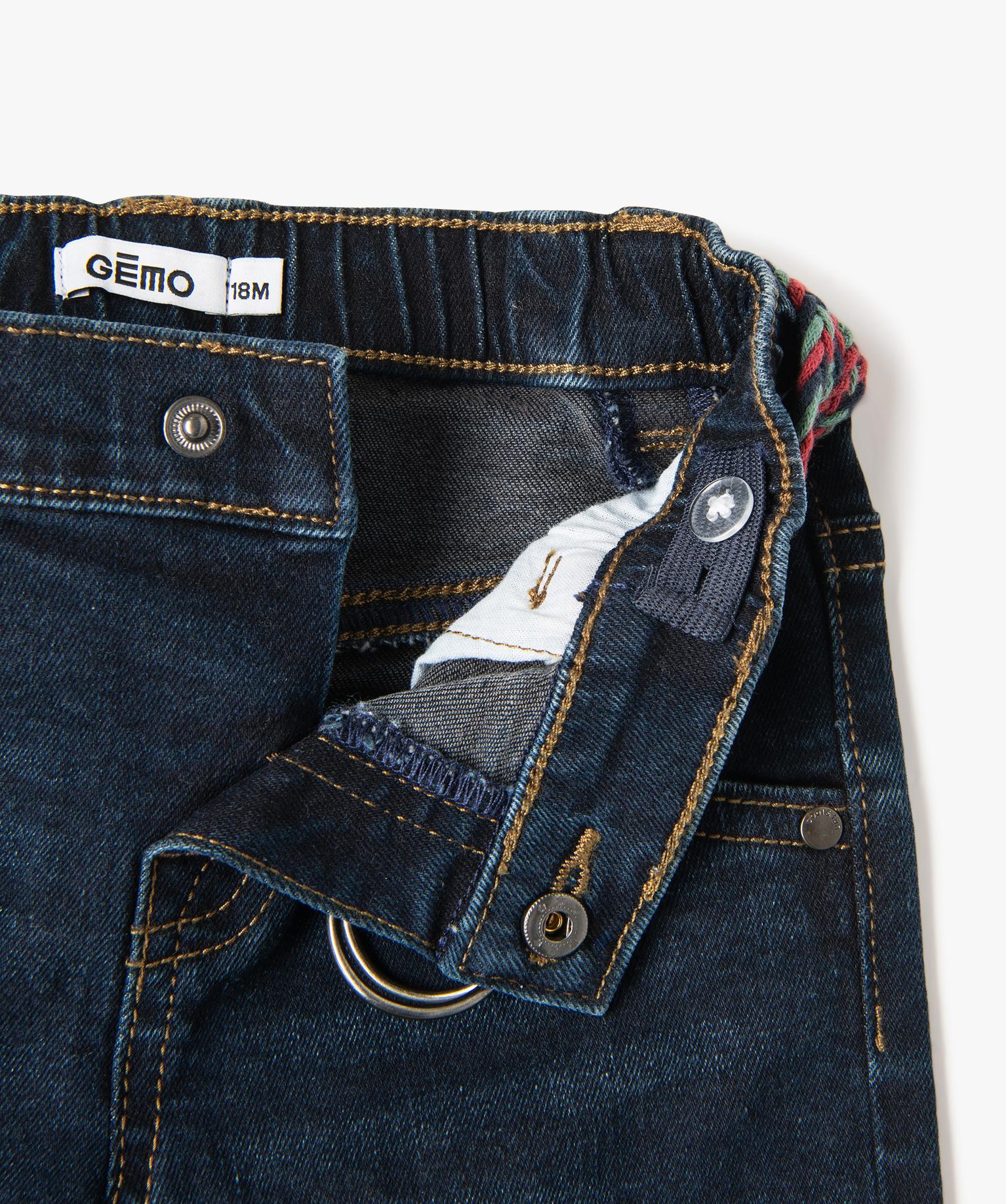 Pantalon indispensable du vestiaire des enfants, le jean s’accompagne ici d’une jolie ceinture tressée tricolore fermée par une double boucle, pour toujours plus de style. Un jean bébé garçon confectionné dans une toile denim légèrement extensible pour accompagner les mouvements des tout-petits. Il affiche un léger délavage au niveau des zones d’usure et des surpiqûres contrastantes. Sa taille élastique s’ajuste grâce à un élastique dissimulé à l’intérieur. Ce jean bébé possède trois poches sur l’avant et deux poches plaquées au dos. Il se porte avec une chemise, un tee-shirt ou un pull en fonction des occasions. Fermeture par bouton pression.
