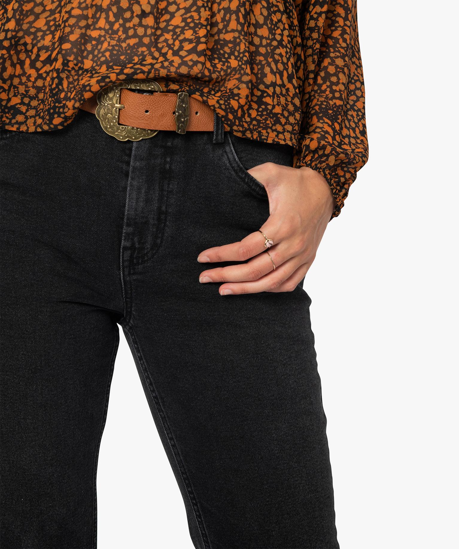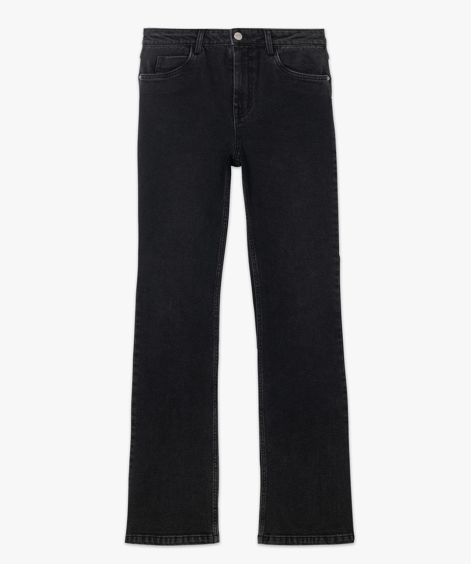 - Coupe Bootcut : jambe ajustée, bas évasé
