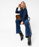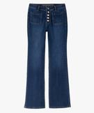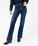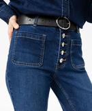 LuluCastagnette signe un jean femme ultra tendance à inclure sans attendre dans le vestiaire denim ! Un jean flare inspiré de la mode des années 70 avec de jolies surpiqûres contrastantes, deux poches plaquées sur l’avant et deux au dos. Il se ferme à l’aide d’une rangée de boutons métalliques siglés qui ne passera pas inaperçue. Un jean taille haute qui sublime la taille et élance la silhouette sans pareil ! Confectionné dans une toile denim extensible il offre un confort exceptionnel. Ce jean évasé dans le bas se porte avec un pull ajusté en maille côtelée et une paire de boots à talon flare.