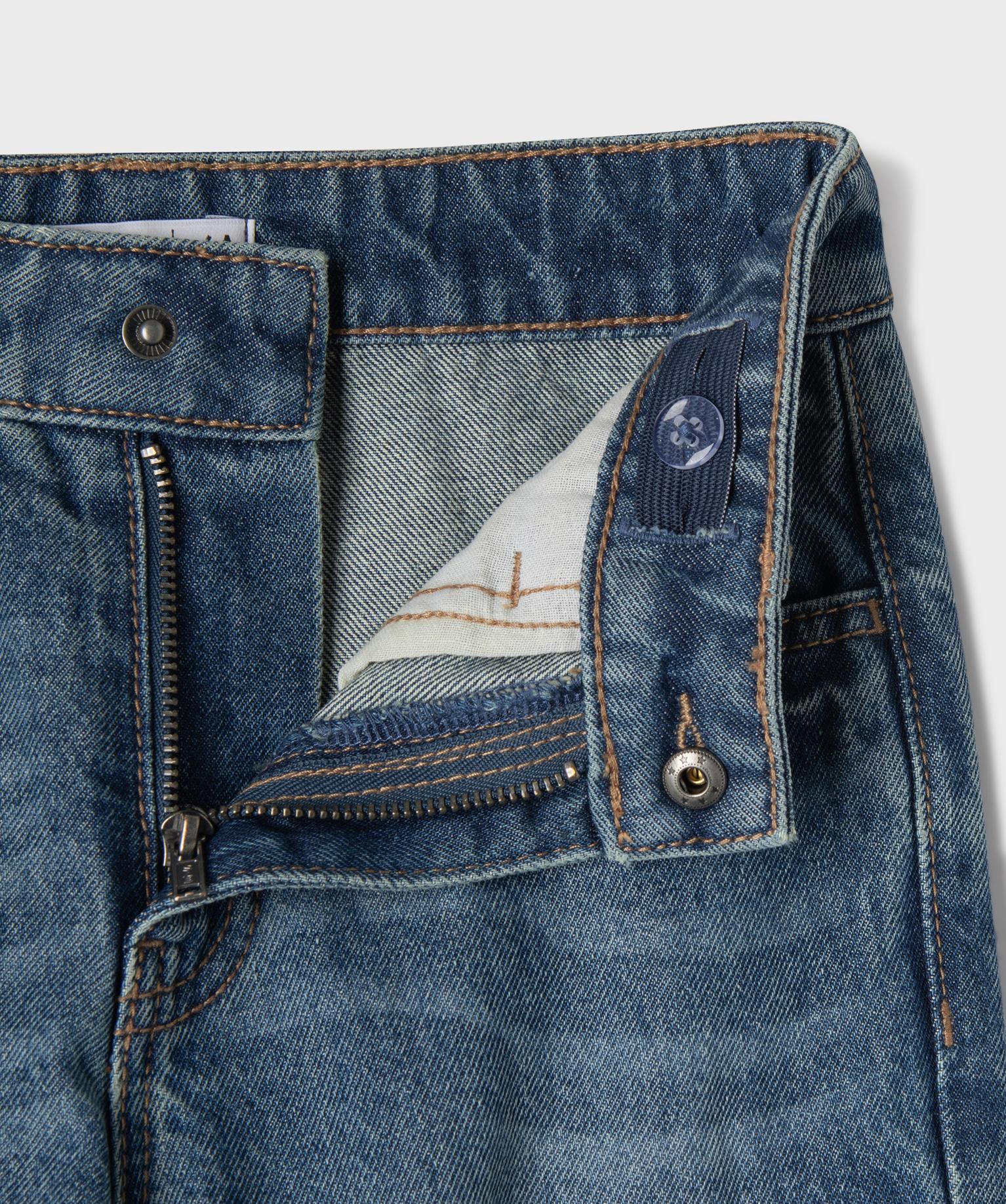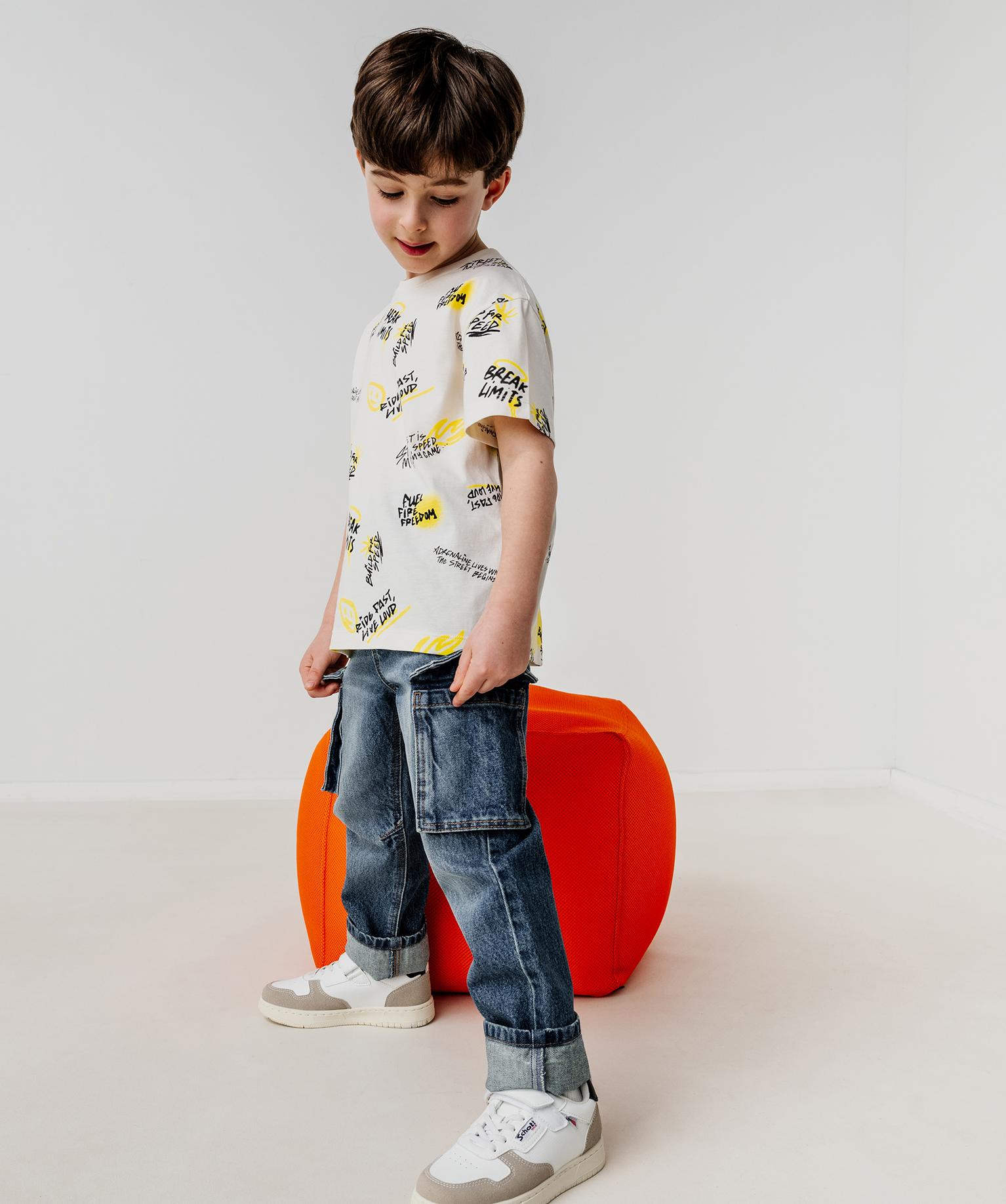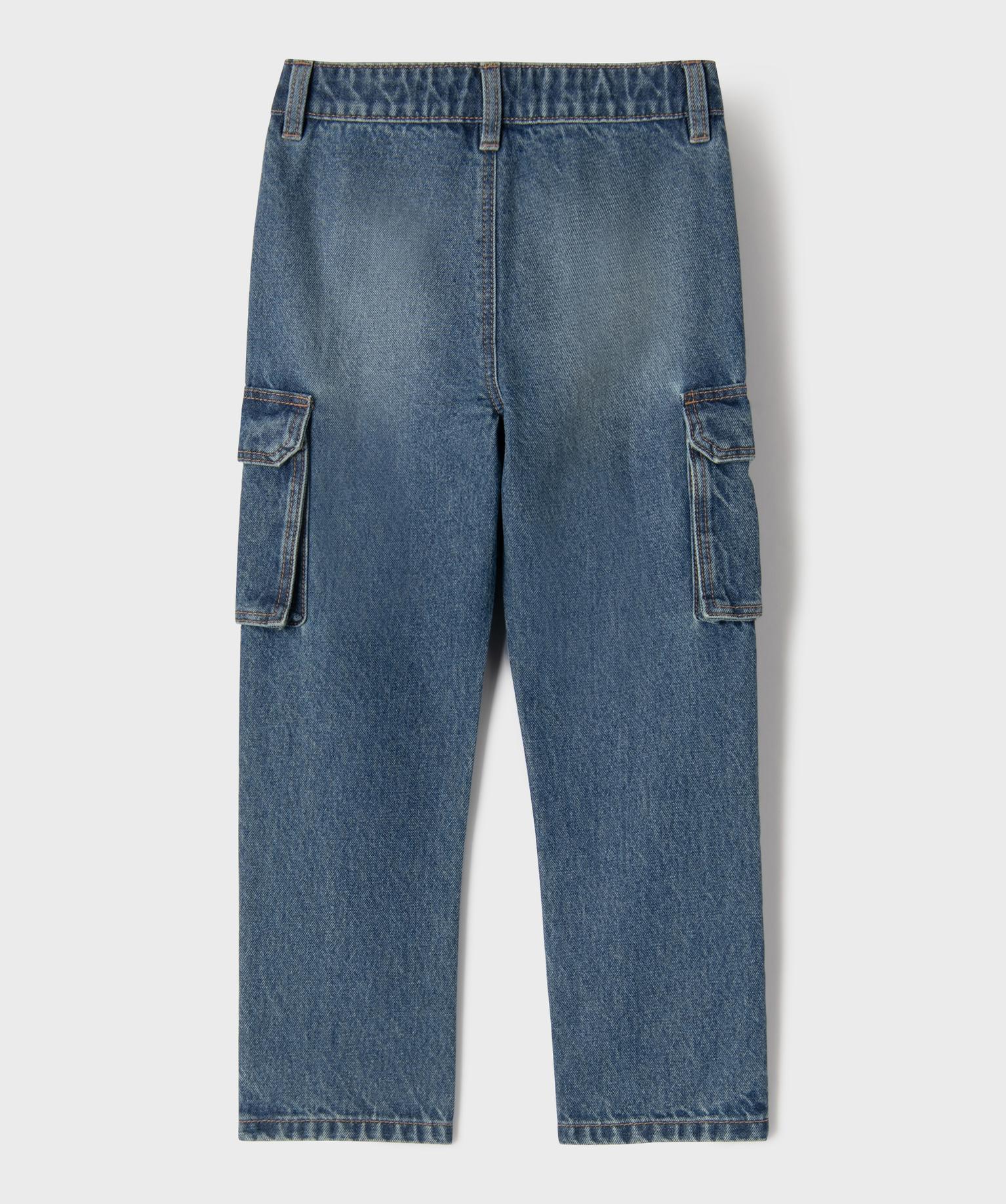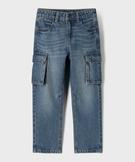 Ce jean pour garçon s'inspire des pantalons cargo avec sa coupe large et ses grandes poches plaquées à rabat sur les cuisses. Fabriqué en denim 100% coton délavé, il offre confort, authenticité et robustesse. Le jean est équipé d'une fermeture zip + bouton-pression facile pour les enfants, avec une taille réglable pour s'adapter à toute les morphologies. Passants pour ceinture. Double surpiqûre contrastante. Pas de poche à l'arrière.