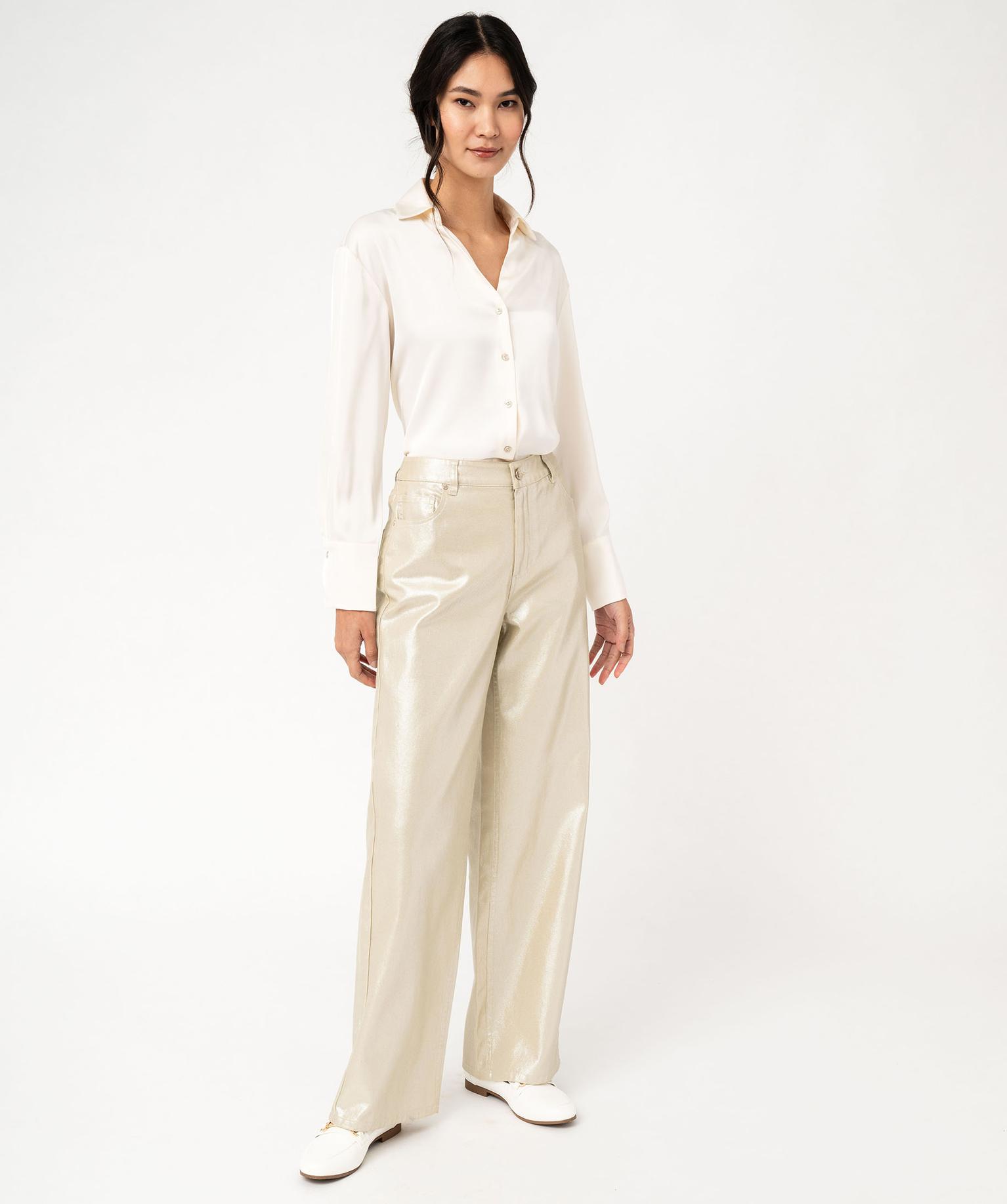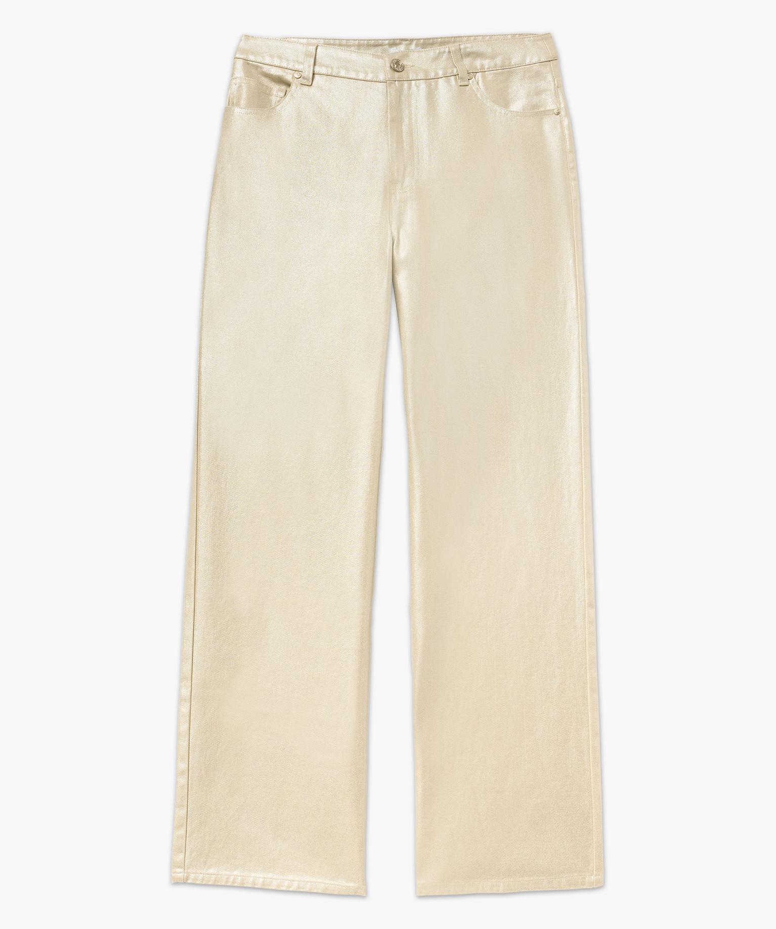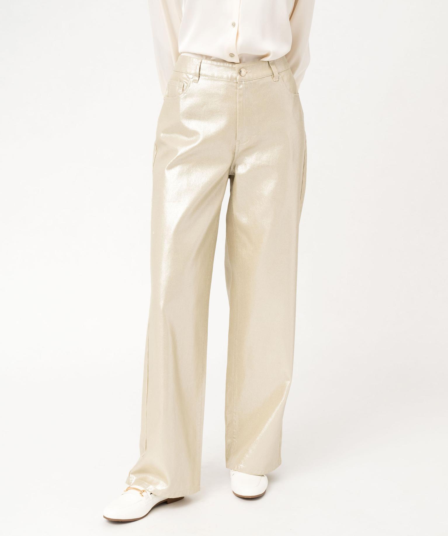 Pour toutes les grandes occasions, le jean se réinvente dans une version scintillante, ajoutant une touche d’éclat dans le dressing féminin. Un jean enduit incrusté de fils métallisés, idéal pour briller en soirée tout en conservant une allure décontractée. Ce jean femme arbore une coupe large, trois poches rivetées sur l’avant et deux poches plaquées au dos. Un jean wide leg à porter avec un haut uni et des boots assortis. Fermeture par zip et bouton.