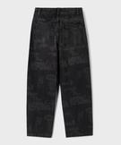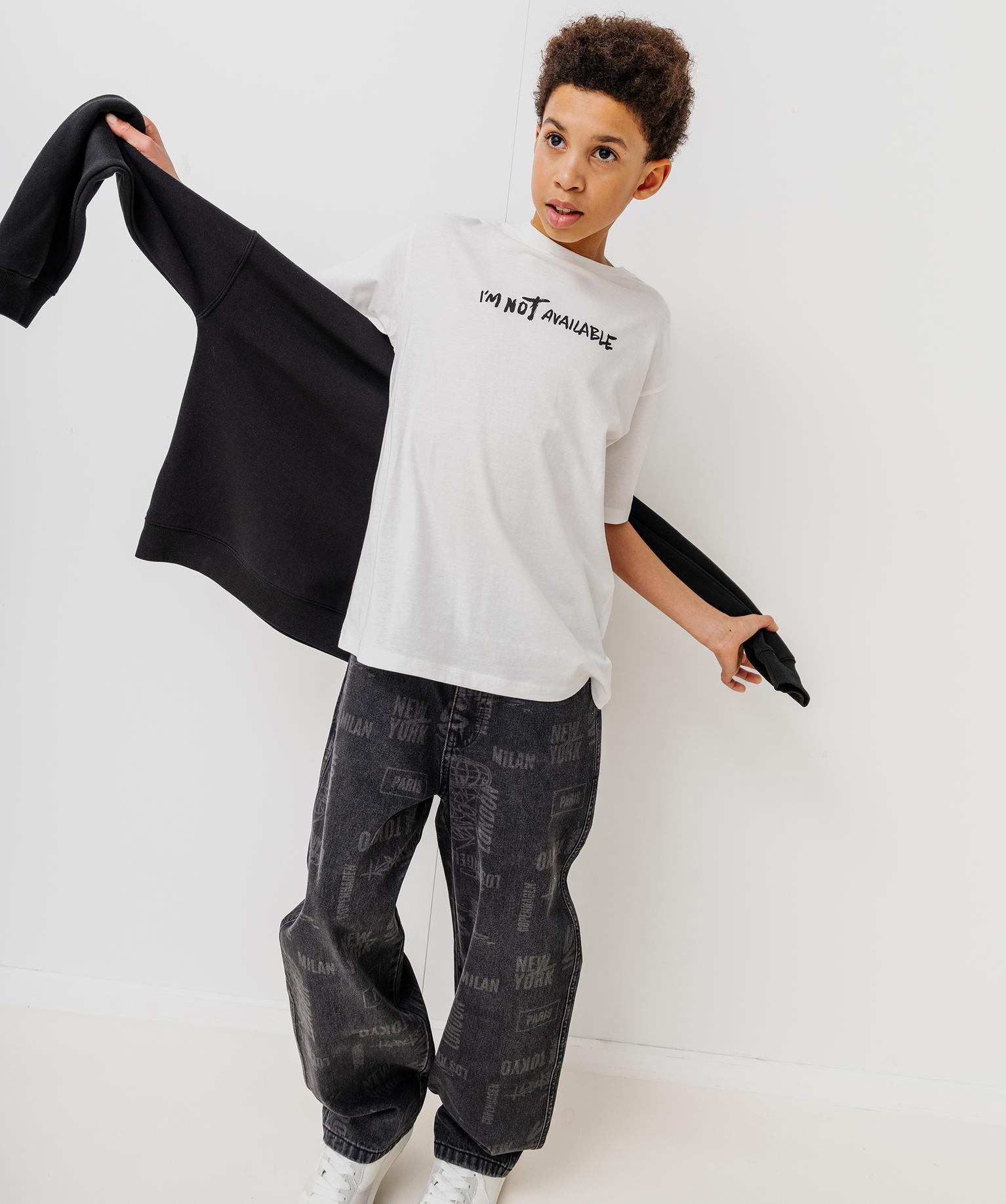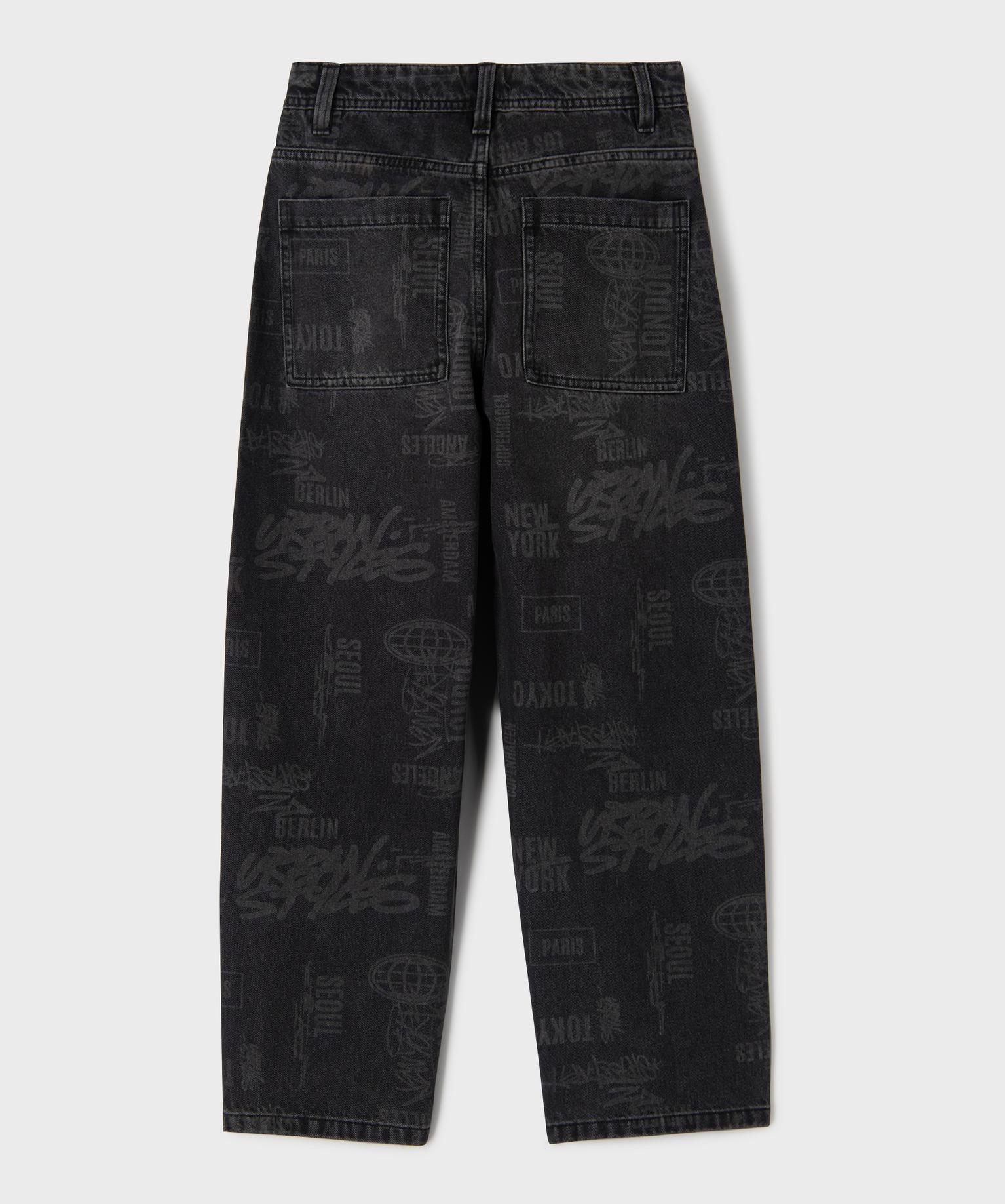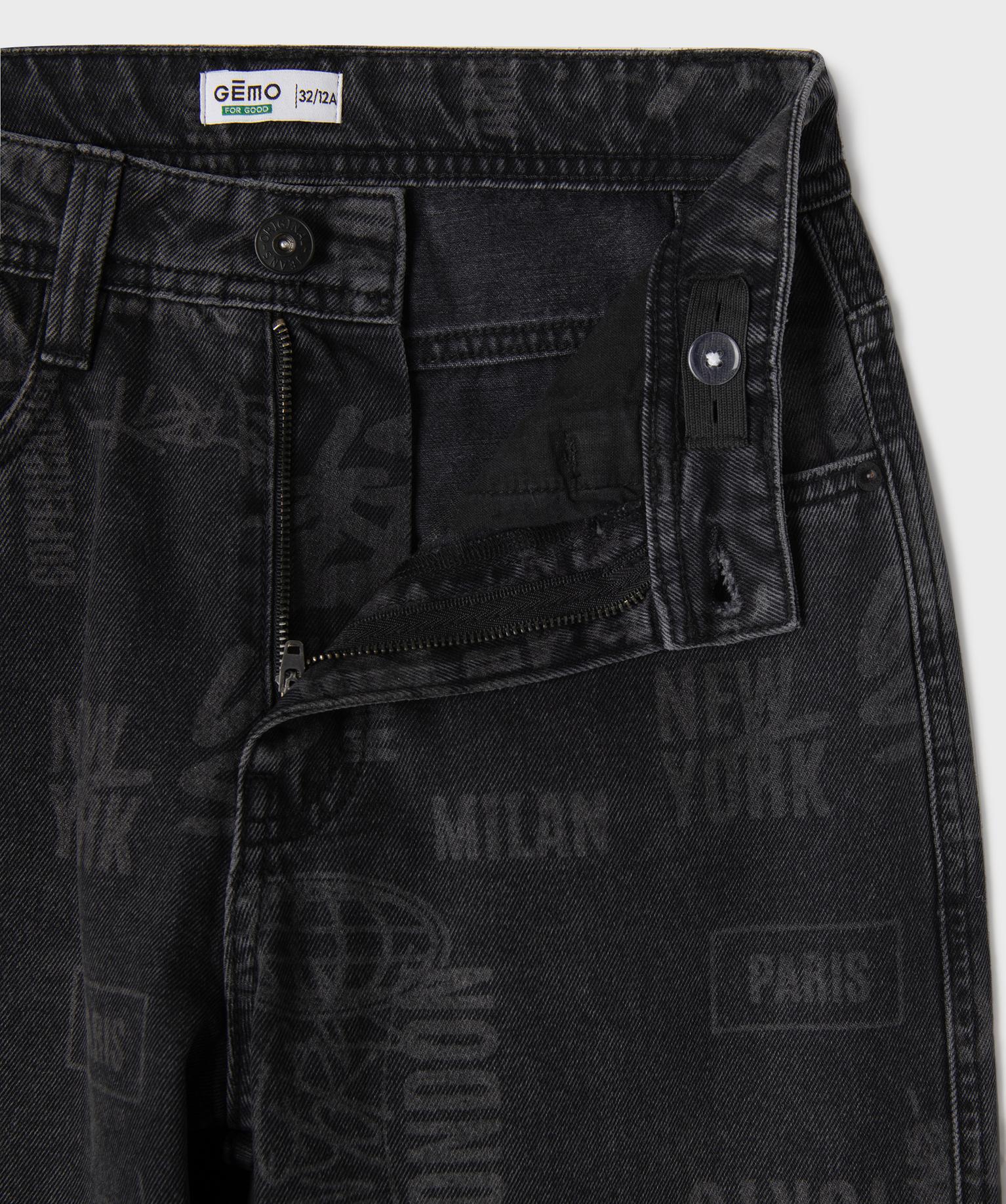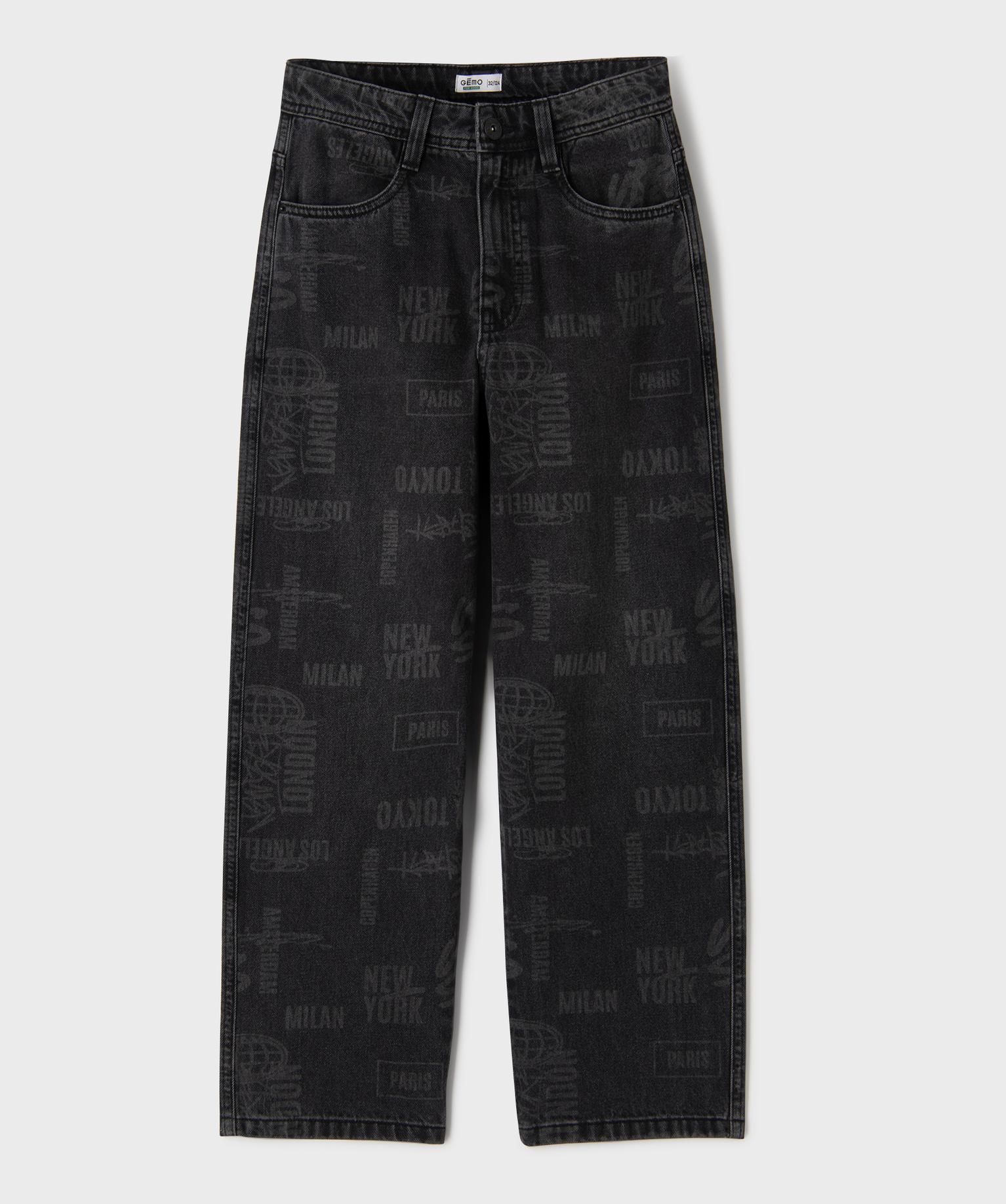Un jean loose qui ose un style affirmé. Le jean garçon en toile denim 100% coton présente un motif d'inscriptions délavées inspirées des grandes villes du monde, pour un look original et tendance. Les 5 poches et la fermeture zip + bouton rappellent les codes classiques du denim. Ce jean large sera la base de nombreux looks urbains inédits et audacieux !
