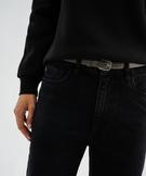 Le jean mom fit continue de séduire avec son esthétique rétro, son confort et sa coupe résolument féminine ! Elle met en valeur la silhouette avec sa taille haute ornée d'une ceinture, sa jambe fuselée qui se resserre vers la cheville et souligne les hanches. Ce jean femme iconique et remis au goût du jour, contient une pointe d'élasthanne pour vous offrir un maximum de confort. Il se décline dans un denim à la couleur intemporelle, facile à marier et à peine délavée, idéale pour compléter vos looks les plus cools comme les plus raffinés. La ceinture fine qui l'accompagne, présente un motif en relief imitation peau de serpent. 3 poches devant + 2 poches plaquées au dos. Fermeture par zip + bouton. Passants pour ceinture.