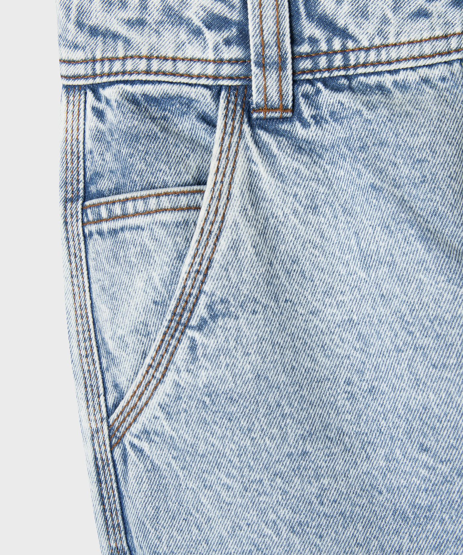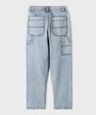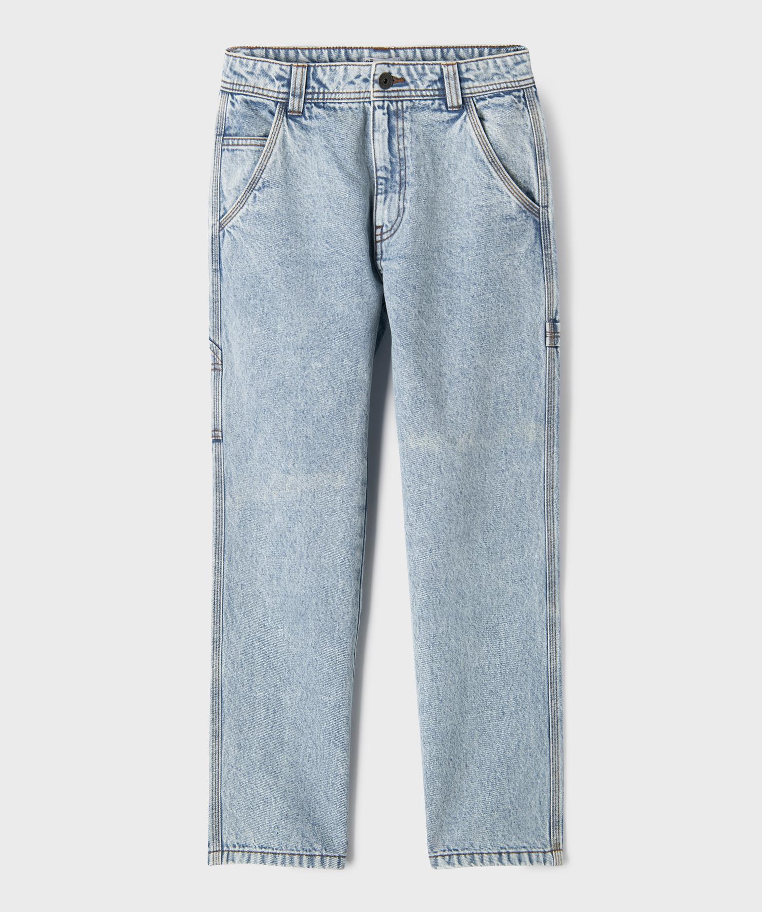 Ce jean charpentier Regular se distingue par son denim 100 % coton au délavage marqué, qui lui donne un look authentique et vintage. Pratique et fonctionnel, il dispose de 3 poches sur l’avant, de 2 poches plaquées au dos, de 2 poches supplémentaires sur la cuisse droite ainsi que d’une bride sur la cuisse gauche, fidèle aux codes du pantalon de travail. La fermeture se fait par zip et bouton, complétée de passants pour ceinture. Pour plus de confort, le jean garçon a taille est discrètement réglable grâce à un élastique intérieur. Un jean robuste et stylé, pensé pour conjuguer allure décontractée et praticité.