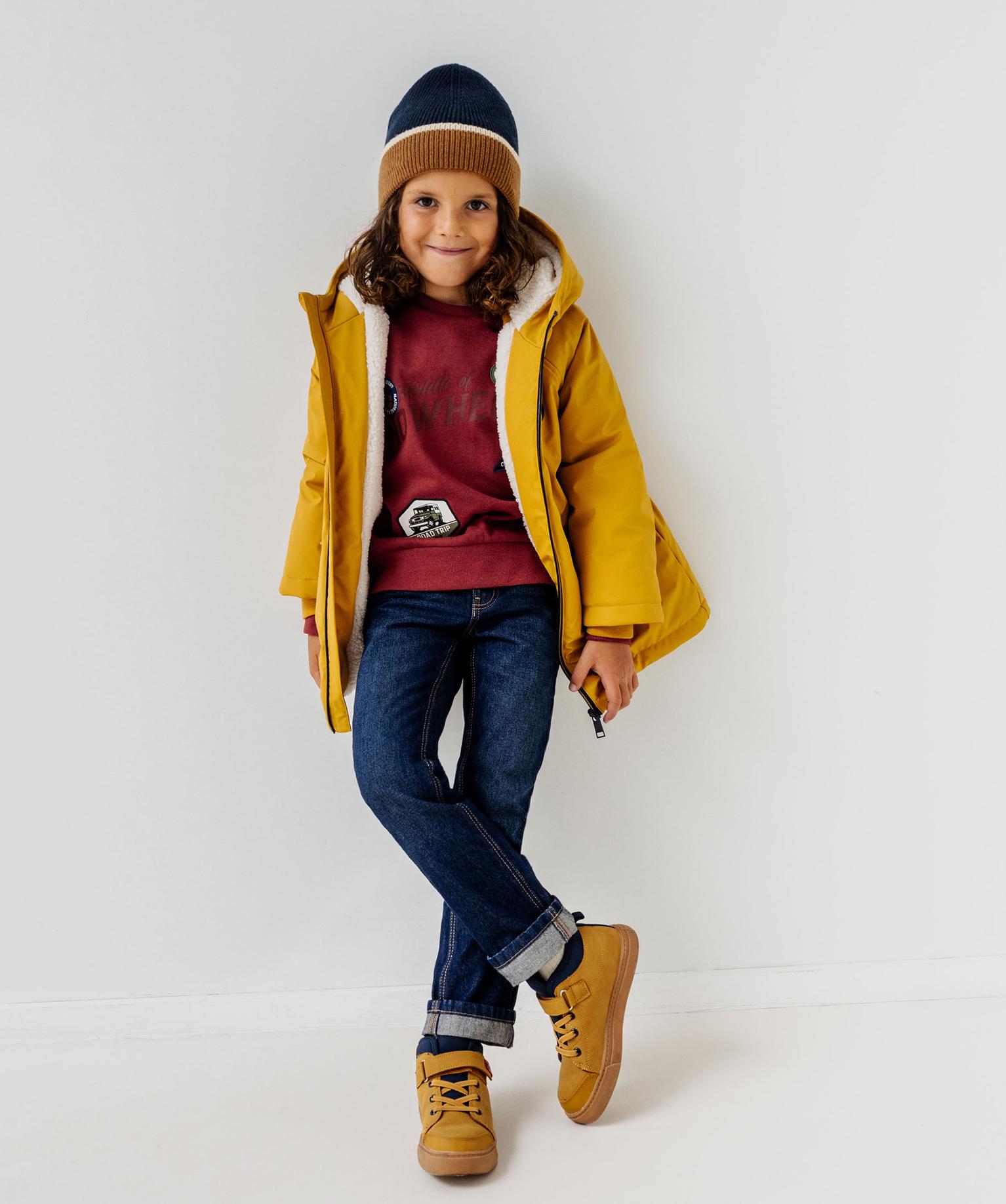 Ce jean regular en denim 100% coton fait partie des essentiels du vestiaire des enfants. Il arbore une coupe droite confortable qui s’adapte à tous les styles. Ce jean garçon possède une taille réglable par élastique intérieur permettant de s’adapter à toutes les morphologies. Il est doté de 3 poches rivetées à l'avant et 2 poches plaquées au dos, et se ferme par zip et bouton-pression. Un jean à porter avec tous les hauts du vestiaire qu’il soit chic ou casual.