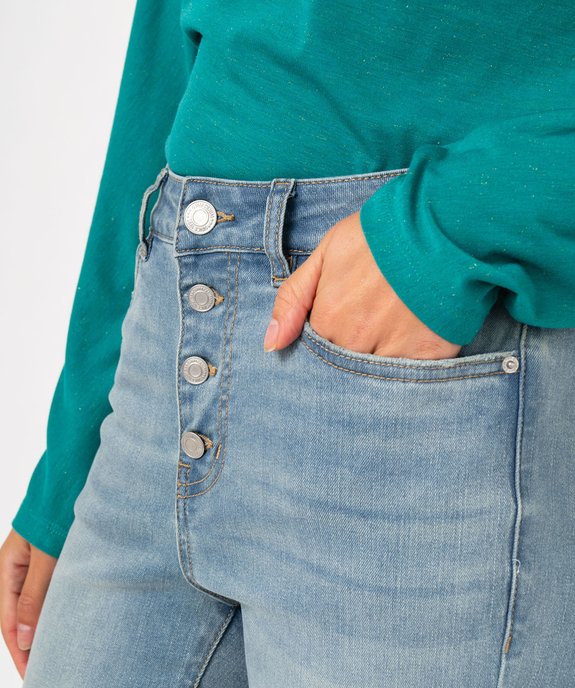 Ce jean Skinny est le choix idéal pour sublimer votre silhouette ! Ce jean pour femme est taillé de manière ajustée, épousant parfaitement les courbes, et est doté d'une taille haute qui sculpte élégamment la ligne. Fabriqué dans une toile denim extensible incroyablement confortable, il présente un léger délavage pour un look tendance et se ferme par une braguette boutonnée qui ajoute une touche de style. Il constitue le jean parfait pour créer des tenues tendance, à associer avec un haut ample et des bottes. Trois poches à l'avant et deux poches plaquées à l’arrière.