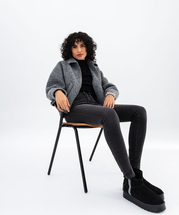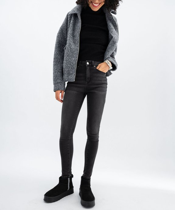Ce jean skinny vous accompagnera dans tous vos looks. Un pantalon femme qui respecte les codes du jean : poches rivetées sur l’avant, poches plaquées au dos et fermeture par zip et bouton. Un jean taille haute qui sublime la ligne et assure un maximum de confort grâce à sa matière extensible. Caméléon, il s’adapte à toutes vos envies et s’intègre aussi bien dans un look sportswear avec un sweat à capuche, que dans un look élégant avec une chemise et une veste de tailleur.