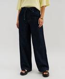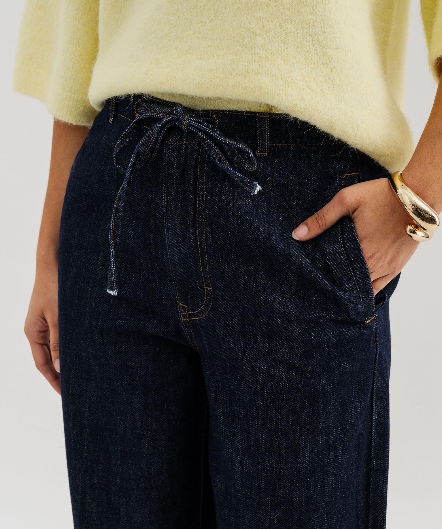 Ce jean femme réinvente le le style denim en se mêlant subtilement aux codes du pantalon habillé. Une coupe large, une toile fluide, une taille haute élastiquée au dos, un cordon à nouer devant et des poches raglan intégrées dans les coutures latérales, ce pantalon s'inspire largement du pantalon en toile. Il est également doté de deux poches plaquées au dos et de passants pour ceinture. Un jean wide leg élégant, moderne et confortable, à porter avec un tee-shirt et des baskets pour une silhouette décontractée, ou avec une chemise et des escarpins pour un look city chic.