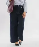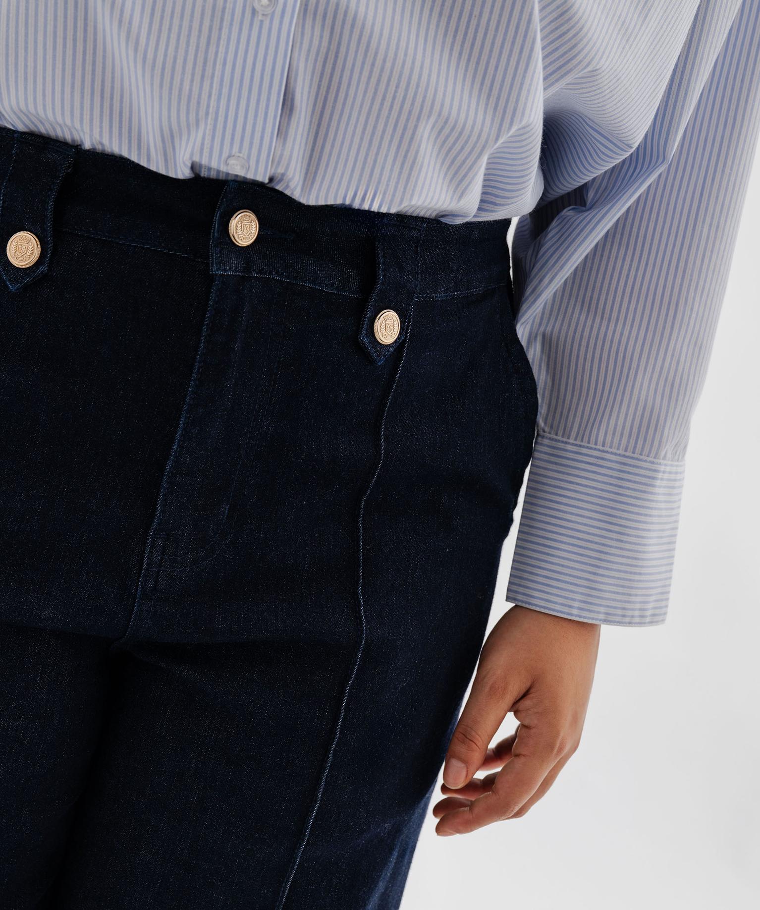Craquez pour ce jean wide leg rehaussé par de sublimes boutons dorés. Un jean pour femme grande taille (du 46 au 54) décliné dans un coloris authentique et élégant, arborant une surpiqûre en relief sur l’avant et de larges passants à la ceinture, agrémentés de boutons ornés d’un écusson. Il possède deux poches italiennes et deux fausses poches raglan au dos. Confectionné en toile denim extensible, ce jean taille haute offre un grand confort. Un jean large indispensable cette saison, à marier avec un pull ample en maille douillette ou avec une chemise en coton. Fermeture zip et bouton.