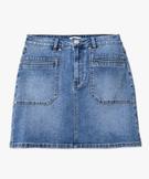 Passants pour ceinture. Poches originales rivetées devant. 2 poches plaquées au dos. Jupe courte mi-cuisse. Délavage aux zones de frottement; Double surpiqûre contrastante.