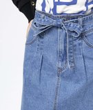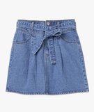 Gémo présente ici une version très féminine de la traditionnelle jupe en jean. Une jupe avec pinces sur l’arrière et plis plats sur l’avant, qui avantage la silhouette. De jolies surpiqûres à la taille et une ceinture ton sur ton à nouer, mettent la taille en valeur. Elle se ferme par zip et deux boutons. Une jupe femme à porter avec un tee-shirt et des baskets toute la saison. 2 poches sur l'avant.