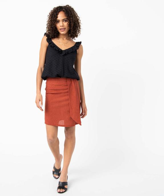 Cette jolie jupe pour femme apportera une touche scintillante dans le dressing grâce à sa matière texturée aux reflets scintillants. Elle offre un bel effet drapé sur l’avant et est doté d’une grande bande de tissu fixé à la ceinture. Confectionnée dans une maille extensible, cette jupe droite offre un grand confort. Elle s’enfile facilement grâce à un zip invisible dans le dos. On la porte en soirée avec un débardeur en voile et des escarpins à talon.