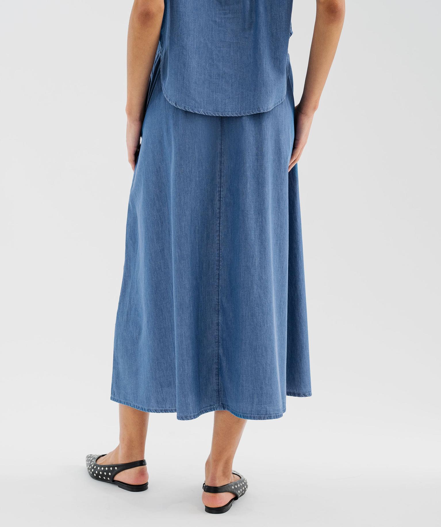 La jupe en jean se réinvente dans une version légère et fluide pour offrir un maximum de confort pour la saison estivale. Une jupe longue évasée dotée d’une ceinture élastique facile à enfiler. Elle possède deux poches latérales dissimulées dans les coutures. Une jupe femme à porter avec un tee-shirt et des baskets pour un look casual tendance.