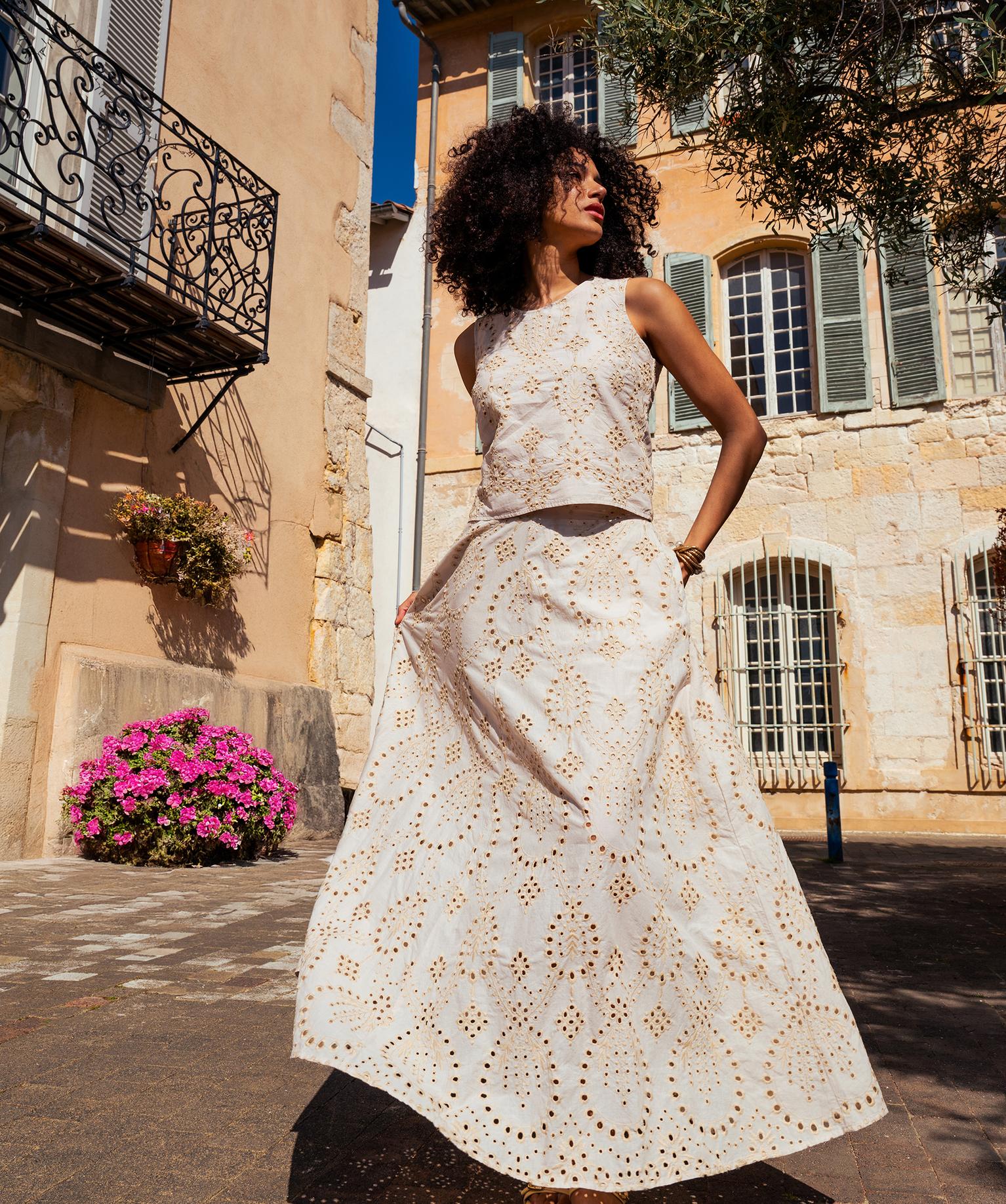 Offrez-vous un look bohème chic avec cette remarquable jupe pour femme. Longue et ample, toute en broderie anglaise, elle prend des airs de jupon ! La coupe généreuse crée un mouvement élégant à chaque pas. La broderie anglaise laisse deviner la peau en transparence. Une doublure courte assure l'opacité sur la partie haute de la jupe. La ceinture smockée au dos offre un maintien parfait. Elle est plate devant pour une ligne nette. On note les deux poches discrètes dans les coutures latérales. Une jupe parfaite à porter avec un top léger en crochet ou un chemisier rentré dans la ceinture pour une allure féminine et décontractée.