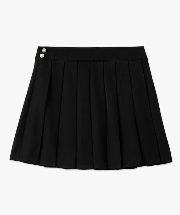 La traditionnelle jupe plissée se modernise avec une coupe courte, un tissu au tomber lourd et impeccable, une large taille décorée de boutons fantaisie recouverts de strass et de perles. Cette jupe noire se porte aussi bien en journée avec un sweat et des baskets pour un look universitaire tendance, qu'en soirée avec des mocassins et une blouse élégante.