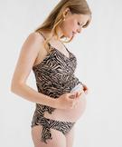 Spécialement imaginé pour les futures mamans qui ne veulent absolument pas renoncer à la mode pendant leur grossesse, le maillot de bain de grossesse forme tankini à motifs zébrés ! Composé d’un débardeur et d’une culotte, ce maillot de bain 2 pièces offre un maximum de confort tout en protégeant le ventre. Le haut de maillot de bain possède des bonnets paddés et affiche un bel effet drapé qui sublime le décolleté. Il possède des bretelles ajustables et une boucle clipsable au dos. Le slip de bain assorti est entièrement doublé et présente des nœuds sur les hanches. Un maillot de bain tankini qui s’adapte à la taille de votre ventre tout au long de l’été !