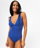 Assurez-vous une allure de star tout l’été grâce à ce maillot de bain une pièce. Un maillot de bain femme avec bonnets triangles dotés de coussinets amovibles et de larges bretelles à nouer sur les épaules. Bien échancré sur les hanches, il sublime et allonge les jambes. Ce maillot de bain à l’allure rétro affiche un confection totalement actuelle puisqu’il est fabriqué à partir de matières recyclées !