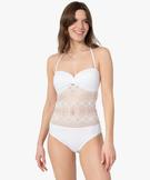 Sublimez votre silhouette avec ce maillot de bain une pièce en maille ajourée. Un maillot de bain avec bretelles amovible à nouer dans le cou, qui peut se porter en bustier. Il sublime la poitrine grâce à des bonnets paddés sans armatures mais qui tiennent parfaitement en place grâce à une fine bande de silicone. Ce joli maillot de bain femme est doublé sur la partie culotte et transparent sur le ventre pour un look ultra glamour. Il est largement ouvert dans le dos et se ferme par une boucle à clipser.