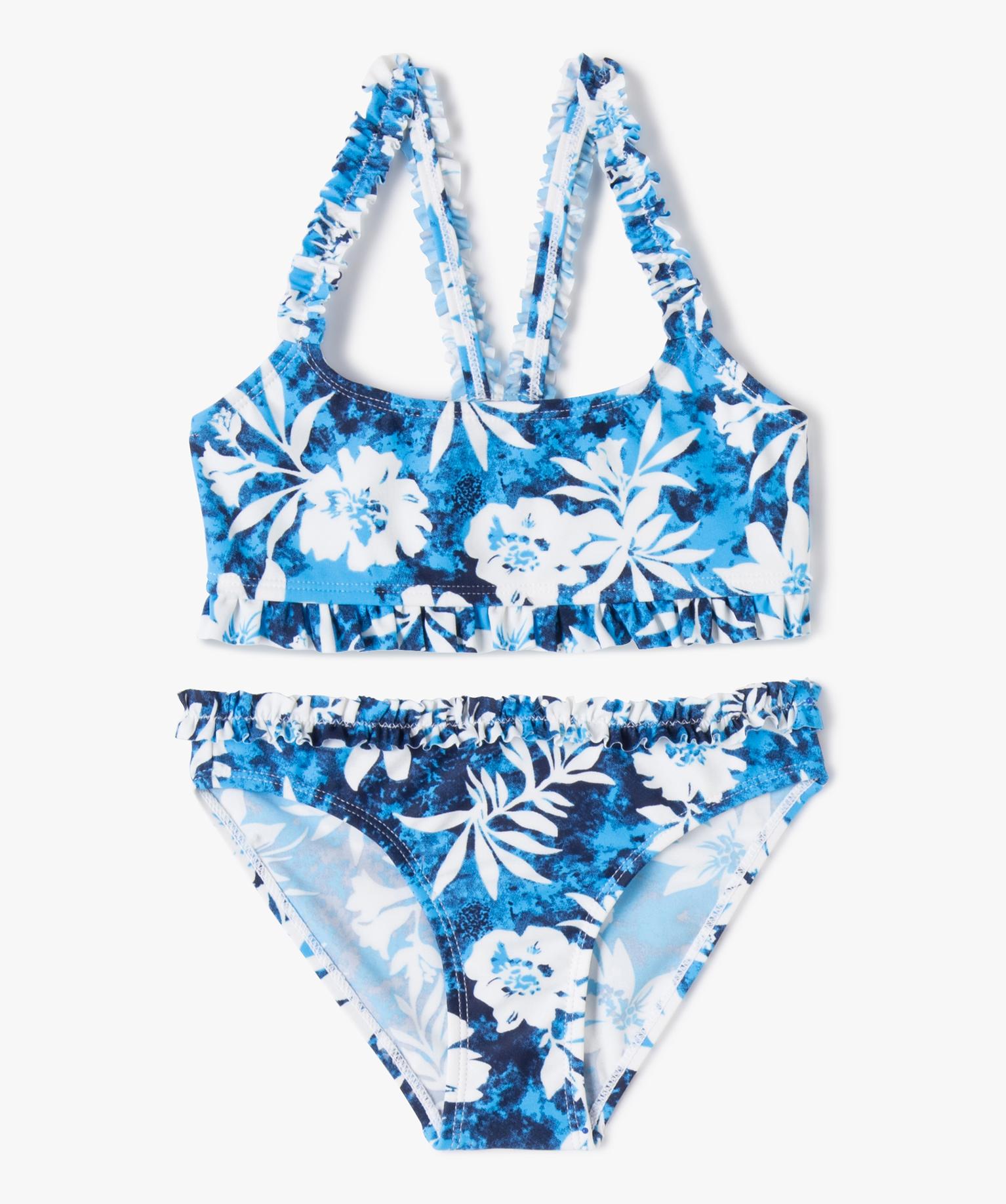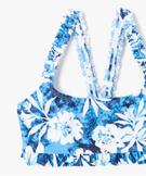 Laissez-vous charmer par la fantaisie et le girly de ce ravissant maillot de bain à motifs fleuris. Un maillot de bain fille 2 pièces composé d’un haut brassière et d’un slip de bain. Le haut du maillot est orné d’un petit volant autour du buste et de bretelles volantées qui forment un V dans le dos. On retrouve les mêmes fronces à la taille du slip, comme une petite basque adorable. Devant de la culotte et de la brassière doublé. Confortable et joli, le 2 pièces est aussi écoresponsable : le dessus est composé de 82% de polyamide recyclé .