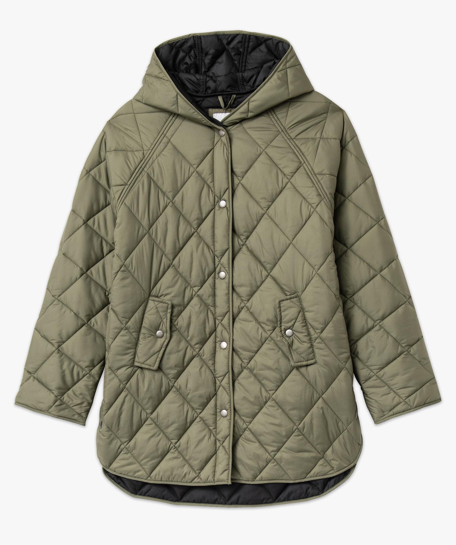 À mi-chemin entre la doudoune, le manteau de mi-saison et le blouson, ce manteau mi-long matelassé et finement rembourré vous garantira une allure féminine et une douce chaleur. Idéal à l'entre-saison, ce manteau fin se porte également comme une couche intermédiaire sous une parka, un trench ou un manteau les jours de grand froid. vous apprécierez le confort de ses manches raglan, de ses fentes modulables par bouton-pression dans le bas et de sa fermeture facile par boutons-pression. Le manteau à capuche possède 2 poches latérales fermées par rabat pressionné.