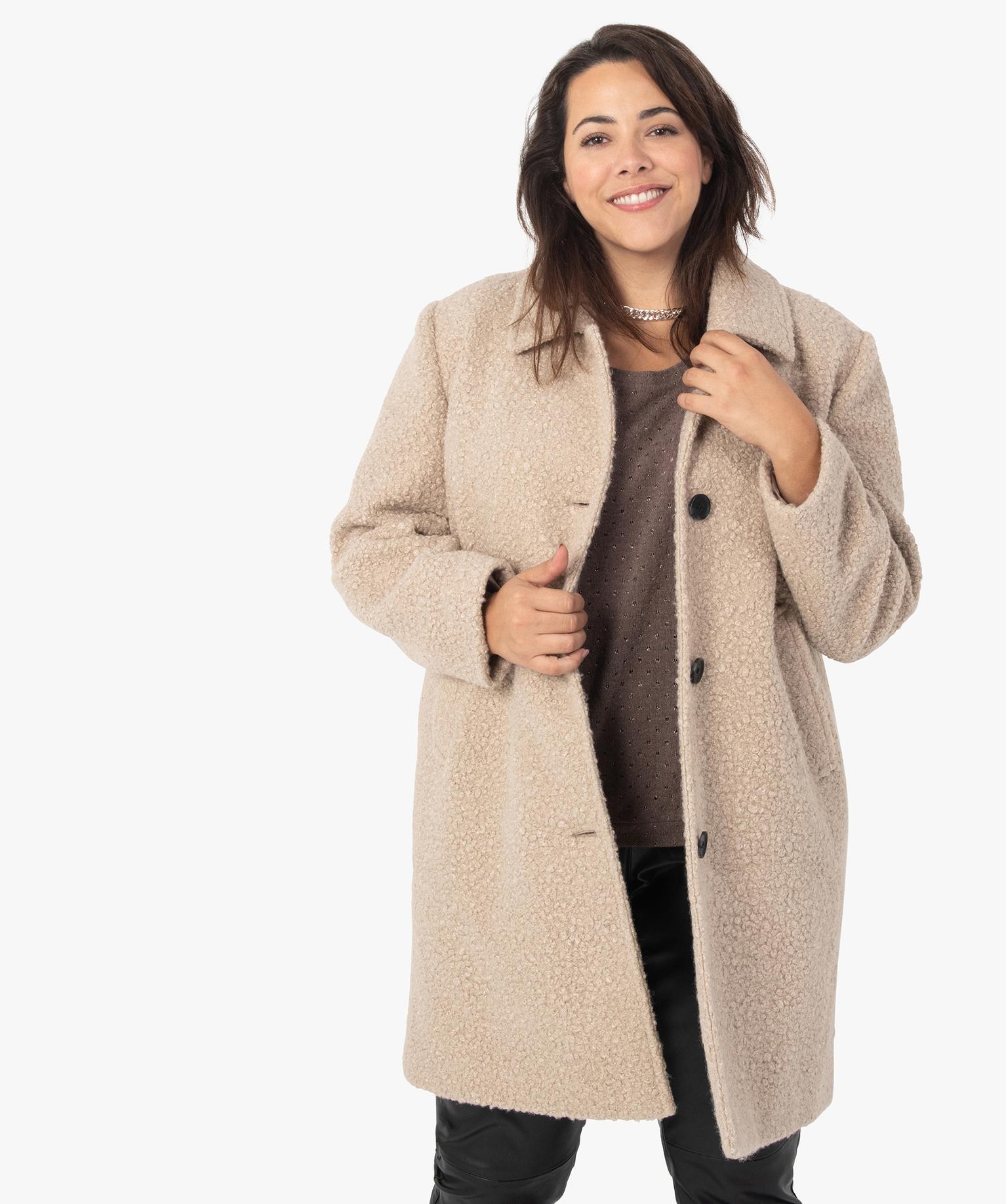 On rêve toutes d'un joli manteau d'hiver qui nous réchauffe tout en valorisant notre silhouette avec style. Avec ce manteau droit coupe classique en maille bouclette, vous serez servie ! Les volumes sont parfaits pour un porté ouvert ou fermé. Le col chemise souligne joliment le port de tête. N'hésitez pas à l'accessoiriser d'un joli foulard. Le manteau femme grande taille (du 46/48 au 54/56) possède 2 poches raglan passepoilées devant, une doublure matelassée finement rembourrée et de gros boutons contrastants.