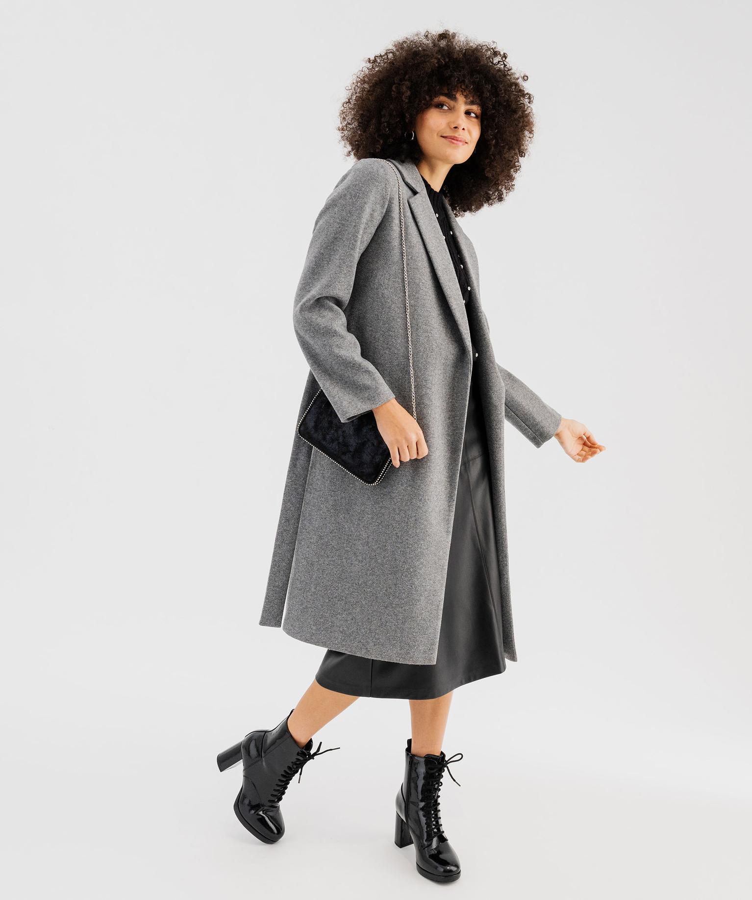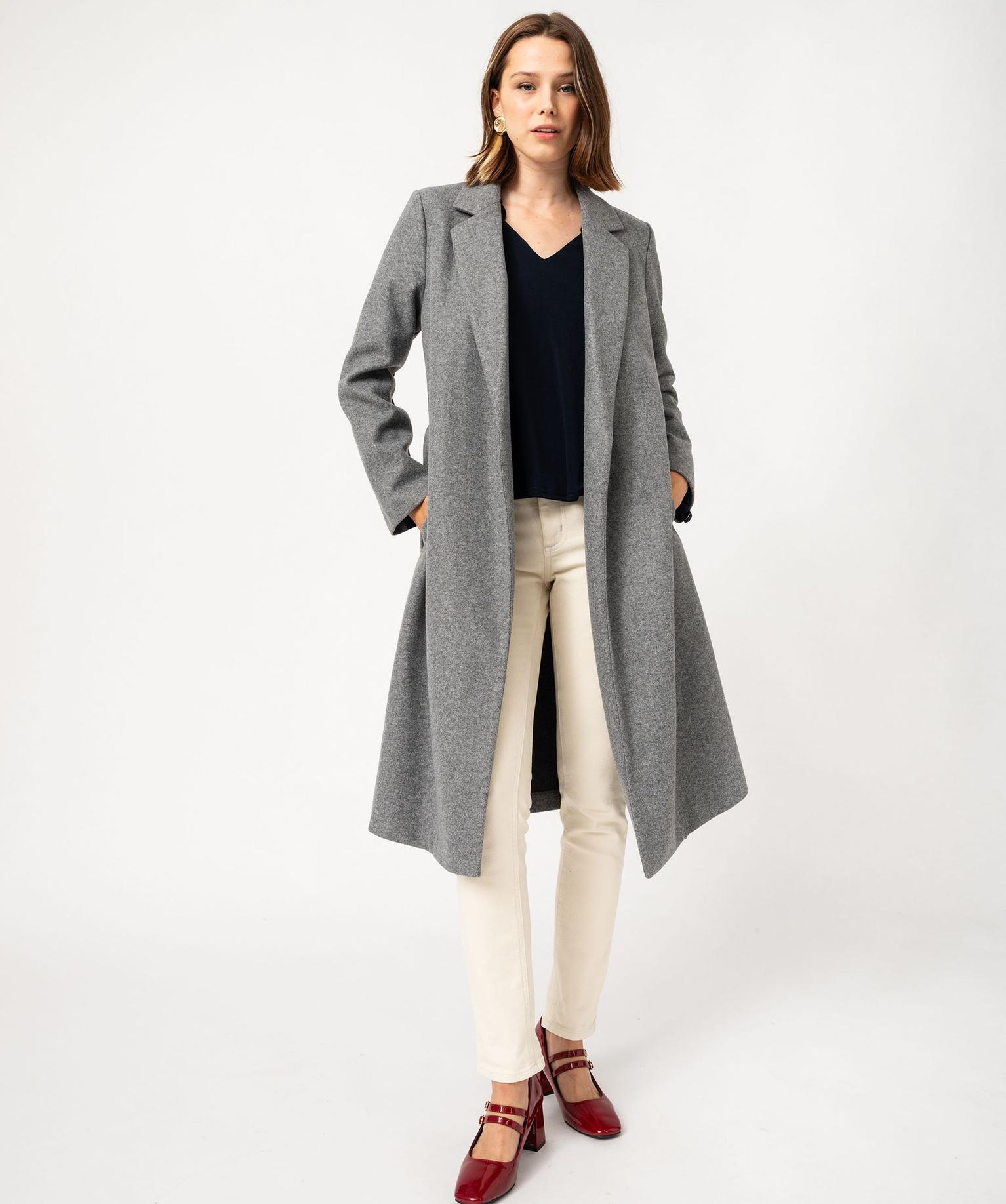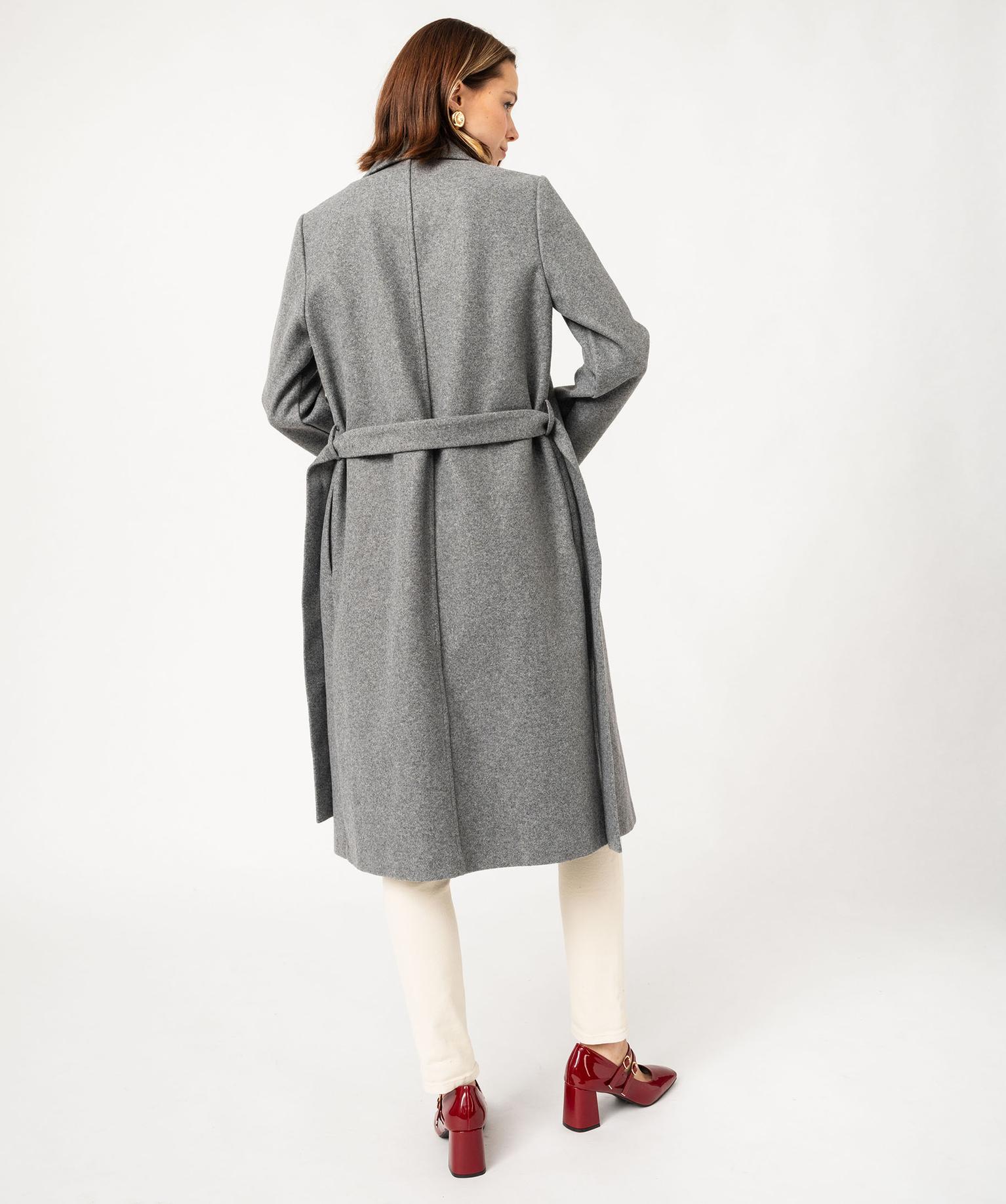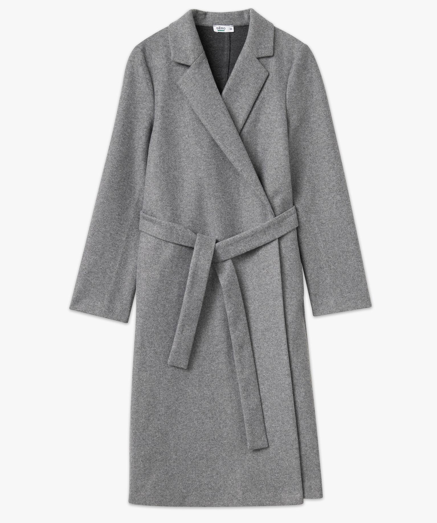 Manteau long aspect drap de laine avec ceinture femme gris