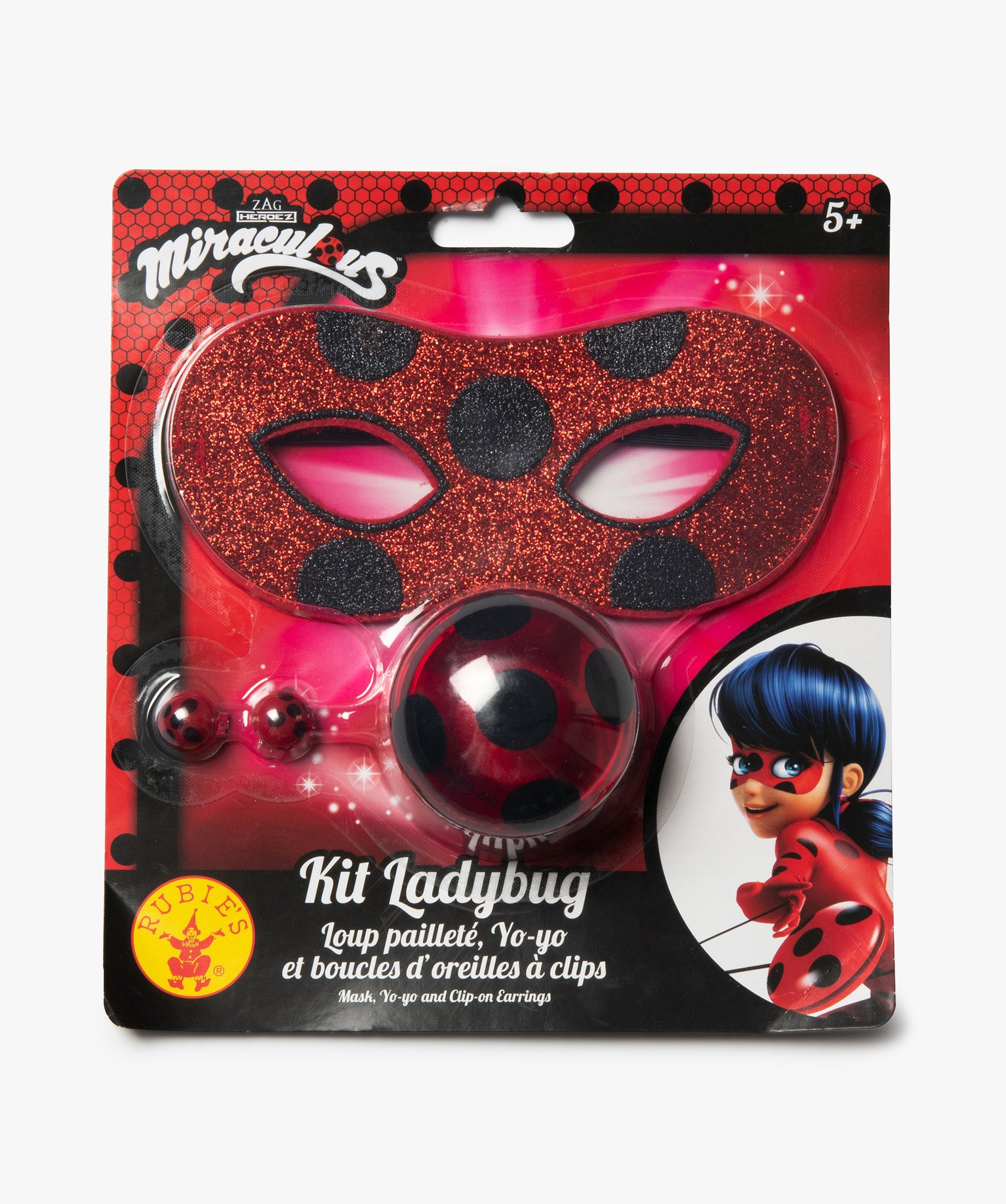Mettez la touche finale - et un peu plus - au déguisement Lady Bug de votre enfant avec ce set de 3 accessoires. Le kit Miraculous comprend un loup pailleté fermé par scratch, un yoyo et une paire de boucles d'oreilles à clip assortis.