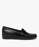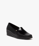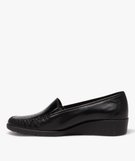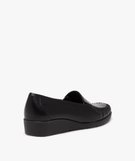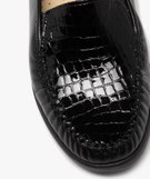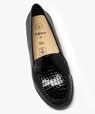 Mocassins femme à semelle compensée dessus en cuir uni et vernis effet reptile noir