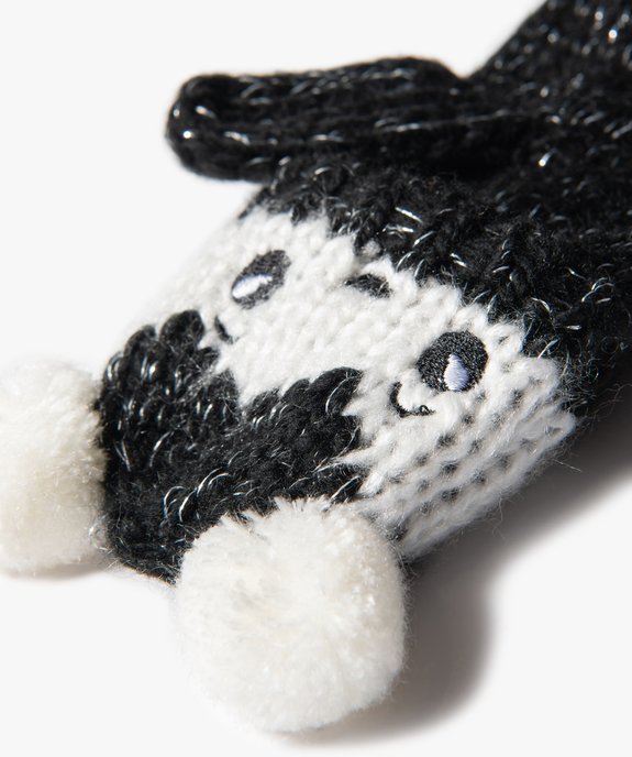 Laissez-vous charmer par cette paire de moufles très ingénieuse ! Une paire de moufles pour fille dont la partie doigt se soulève pour révéler une paire de mitaines. Cet accessoire fantaisie se distingue aussi par son style girly et tout mignon. En effet, les gants sont fabriquées dans une grosse maille pailletée et la partie mitaine est animée d'un motif animal avec pompons en guise d'oreilles. On craque complètement ! Finition bord-côte. Moufles maintenues sur le dessus des mains par un bouton.