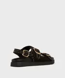 Ces sandales femme femme conjuguent style et caractère avec leur épaisse semelle de 3 cm et leur dessus en suédine orné de clous dorés. Trois grosses boucles dorées viennent structurer le pied, permettre un ajustement personnalisé et apporter une touche rock et bohème irrésistible. Confortables et affirmées, ces sandales donnent du relief à un look simple. Elles s’associent aussi bien à un short en jean qu’à une jupe longue fluide.