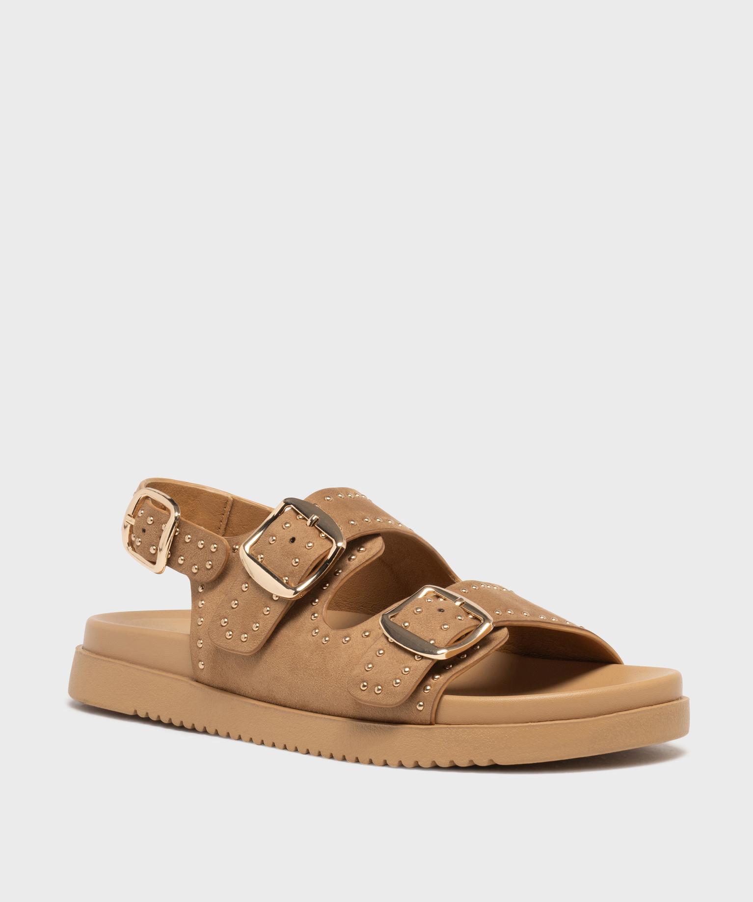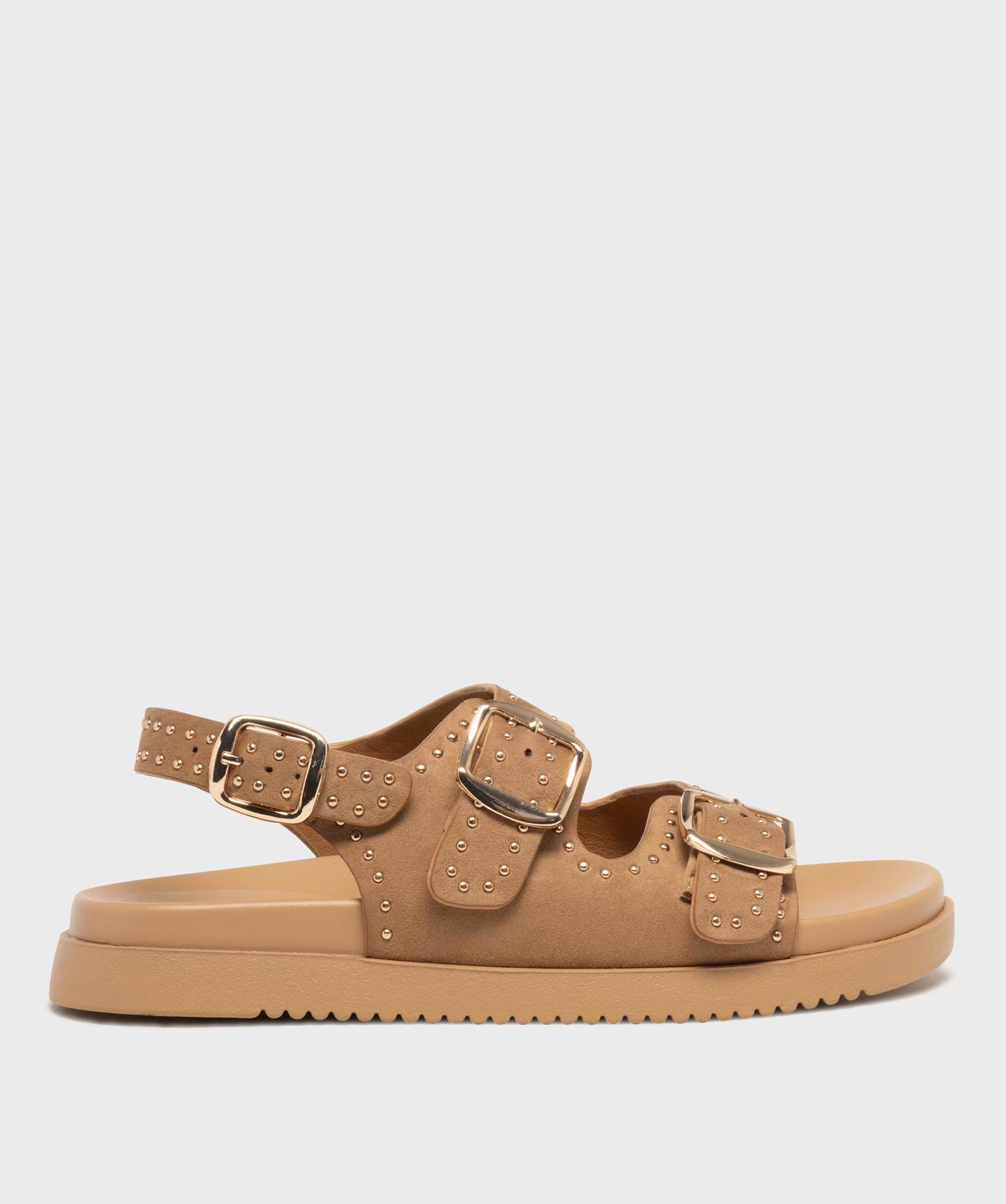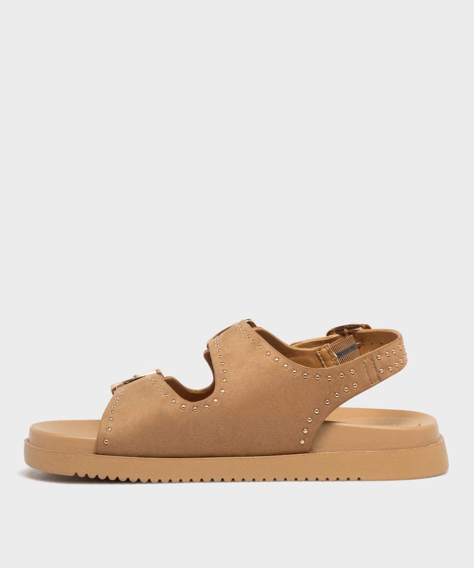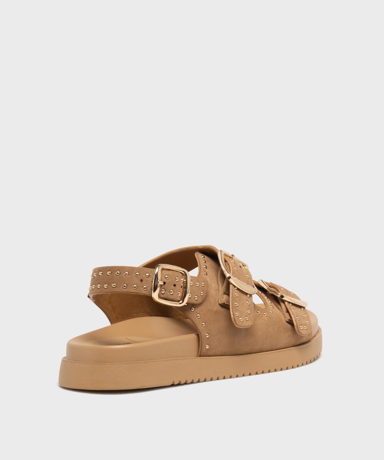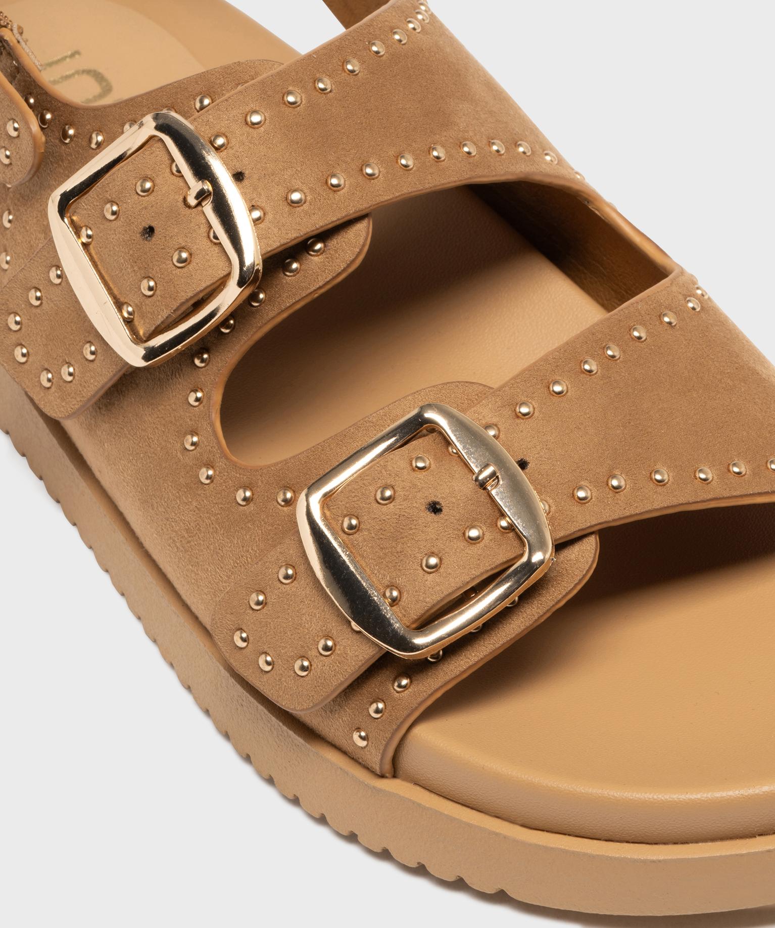 Mules à épaisse semelle en suédine à clous dorés femme beige