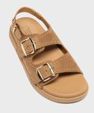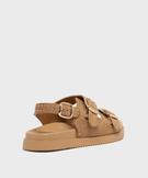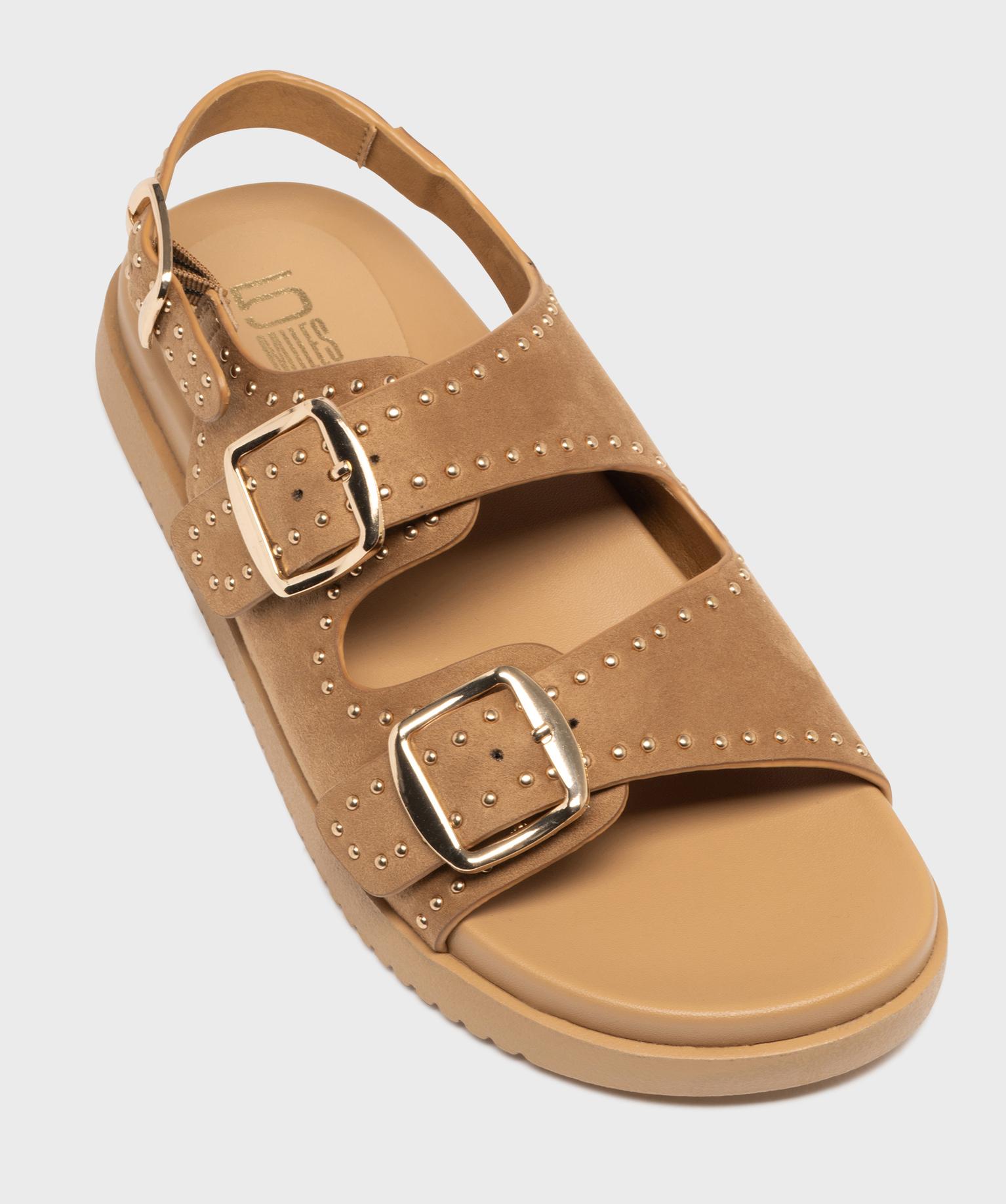 Ces sandales femme femme conjuguent style et caractère avec leur épaisse semelle de 3 cm et leur dessus en suédine orné de clous dorés. Trois grosses boucles dorées viennent structurer le pied, permettre un ajustement personnalisé et apporter une touche rock et bohème irrésistible. Confortables et affirmées, ces sandales donnent du relief à un look simple. Elles s’associent aussi bien à un short en jean qu’à une jupe longue fluide.