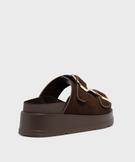 Ces mules pour femme à semelle plateforme revisitent l’esprit décontracté avec une touche glamour. Leur dessus en suédine douce se pare de deux larges brides rehaussées de grosses boucles dorées, féminines et audacieuses. L'ensemble monochrome élégant met en valeur les détails métallisés et allonge la jambe avec subtilité. La semelle intérieure toute douce assure un confort d'accueil parfait. Une version chic et moderne de l’esprit mules estivales, à associer aussi bien avec un jean flare qu’une robe d’été.