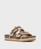 Ces mules femme à semelle plateforme adoptent un style bohème et graphique très actuel. Les larges brides brodées habillent le pied avec élégance et s'ajustent à l'aide de deux boucles dorées. La semelle intérieure, moelleuse et douce, rend la marche agréable. La semelle plateforme de 3,5 cm donne un joli twist à la silhouette. On aime le jeu de matières de la semelle : imitation liège, corde tressée et semelle d’usure crantée qui apporte relief, modernité et caractère. Des sandales 5 Miles féminines, confortables, dotées d’un esprit bohème chic irrésistible.