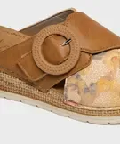 Pour celles qui aiment allier élégance et confort, ces mules à talon compensé sont un vrai atout. La semelle intérieure en cuir ultra-moelleuse et la confection souple et légère vous garantissent un confort optimal. Le dessus se distingue par deux larges brides croisées : l’une en matière lisse avec une grosse boucle ronde décorative, l’autre à motif fleurs craquelé. Pratique et ingénieux, le scratch dissimulé sous la boucle permet un ajustement facile. La semelle intérieure texturée ajoute une touche subtile de style tout en maintenant le pied. Parfaites pour compléter un look casual chic ou habillé, ces mules pour femme se marieront parfaitement avec une jupe longue fluide.