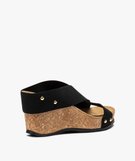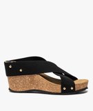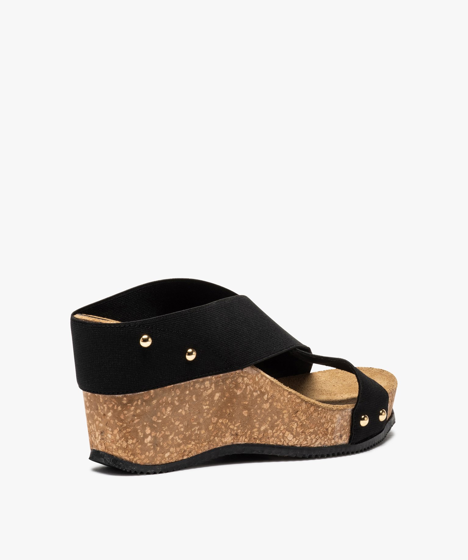 Elles ont toute l’allure de sandales et pourtant ce sont des mules ! La tige est composée de deux larges brides élastiques qui se croisent sur le dessus du pied et viennent se fixer derrière le talon. Une coupe confortable, qui maintient le pied en douceur. Ces mules pour femme sont montées sur un haut talon compensé recouvert de matière imitation liège. De gros clous métalliques fixent les brides à la semelle en apportant une touche glamour. Des mules féminines et confortables, à porter avec une robe fluide ceinturée à la taille pour une belle allure bohème.