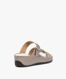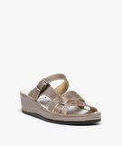 Ces mules pour femme misent sur un maximum de confort, sans oublier le style ! La tige est confectionnée en cuir sur le dessus, un cuir uni aux reflets métallisés. Les finitions sont soignées, avec la semelle intermédiaire recouverte. Ces sandales confort comportent une semelle intérieure en cuir, incurvée et associée à un petit talon compensé de 4 cm. Les brides sont disposées de manière à envelopper le pied en douceur, avec une bride à boucle ajustable pour s’adapter à toutes les morphologies. Des mules confortables et féminines, idéales pour les tenues décontractées.