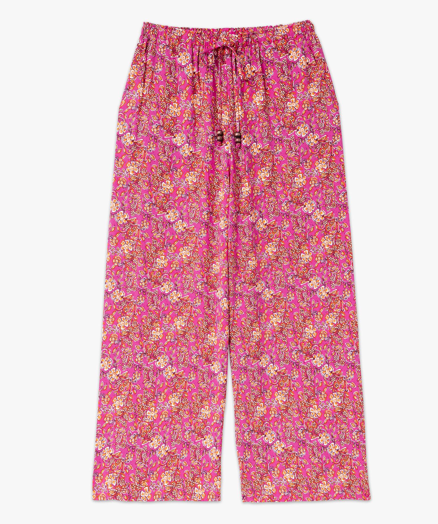 Place aux beaux jours avec ce pantacourt femme ! Un pantacourt ample, léger, parsemé de jolis motifs colorés. Hyper confortable avec sa taille élastique, ce pantacourt trouvera facilement sa place dans votre dressing estival et dans votre valise des vacances. Il se porte aussi bien en ville avec des baskets, un tee-shirt uni et une veste en jean, qu'à la plage avec sandales et crop top ! Sa taille élastiquée est ajustable par cordon coulissant décoré de perles en bois. Le pantalon possède 2 poches dissimulées dans les coutures côté.