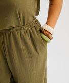 Ce pantalon ample pour femme grande taille (du 46/48 au 54/56) allie à la perfection confort et élégance. Confectionné dans une matière texturée contenant du polyester recyclé, il possède de jolies finitions froncées en bas de jambes, ajoutant une note ultra féminine. Ce pantalon possède une ceinture élastique facile à enfiler et confortable tout au long de la journée. Il possède deux poches latérales dissimulées dans les coutures. Il se porte avec le tee-shirt assorti pour un bel ensemble coordonné, ou avec une blouse imprimée.