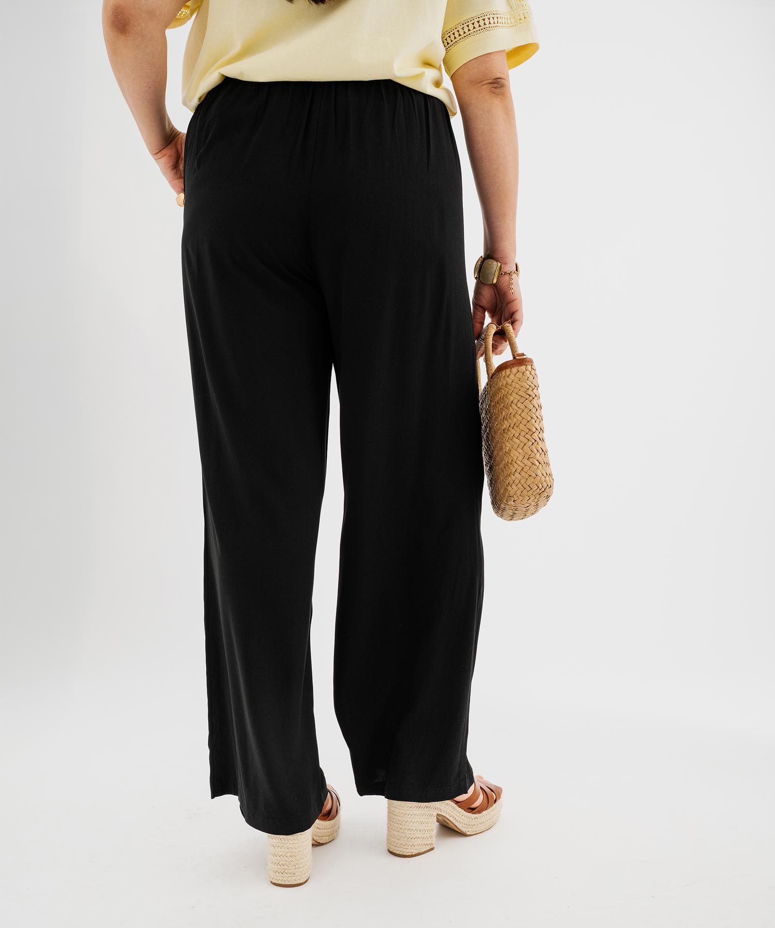 Confort et élégance assurés avec ce pantalon ample entièrement confectionné en viscose fluide. Un pantalon femme grande taille (du 46 au 54) doté de pinces sur l’avant pour encore plus d’aisance et d'une ceinture plate sur l’avant et élastiquée au dos qui facilite l’habillage tout en sublimant la ligne. Ce pantalon fluide sera le meilleur allié d'un tee-shirt et d’une paire de sandales pour un look estival décontracté. Il se porte aussi avec un haut chic et des slingback pour un look plus sophistiqué. Deux poches latérales.