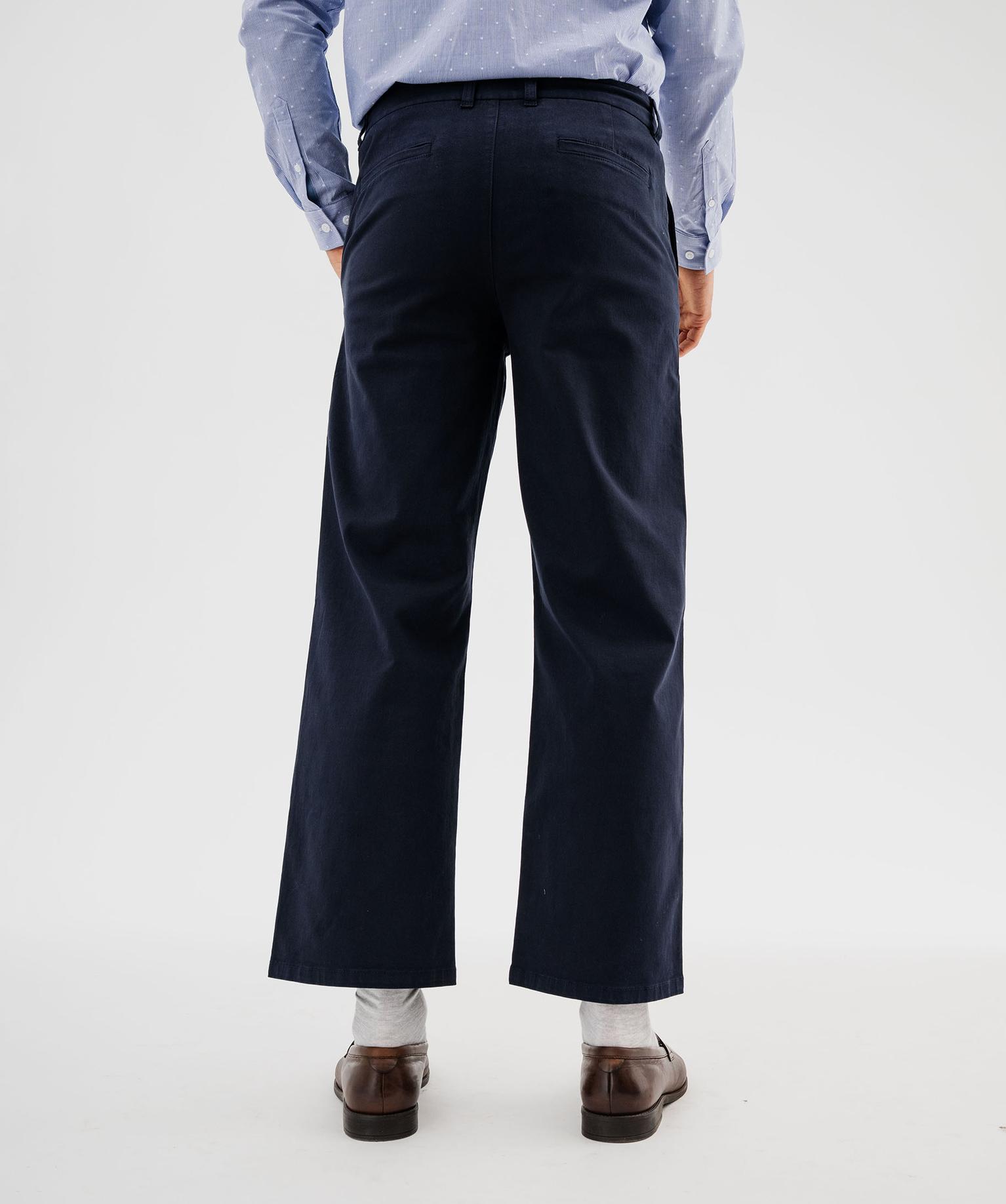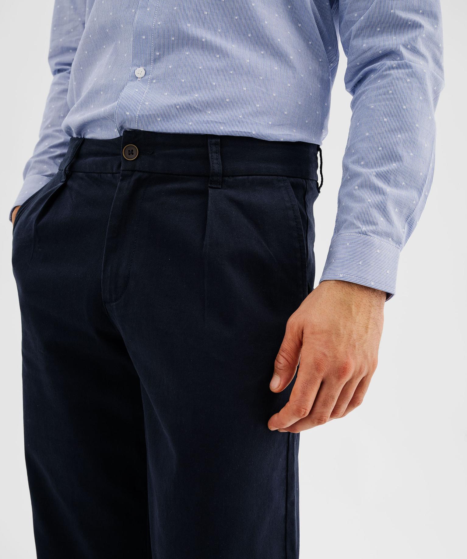 Ce pantalon chino fait partie des essentiels du vestiaire masculin. On aime son allure casual chic et le confort de sa matière en coton extensible. Ce pantalon pour homme affiche une coupe regular confortable et convenant à toutes les morphologies. Sur l’avant, deux pinces donnent encore plus d’aisance. Il possède deux poches italiennes, deux poches raglan au dos, des passants pour ceinture et se ferme par un zip et un bouton. Ce pantalon a subi une teinture spécifique qui lui assure un coloris unique d’un modèle à l’autre. Il se porte avec une chemise et une paire de derbies ou avec un pull et des baskets.