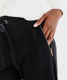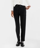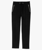 Découvrez une nouvelle version du pantalon de tailleur ! Ce pantalon pour femme est conçu dans une maille fluide et extensible pour un confort optimal. Sa taille élastiquée au dos et son cordon coulissant devant garantissent un ajustement parfait. Pour des finitions soignées, le pantalon présente une coupe cigarette, des plis marqués sur le milieu de la jambe, 2 poches plaquées zippées, une fausse patte de boutonnage et des détails en métal doré. Idéal avec un top en satin ou un blazer.