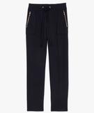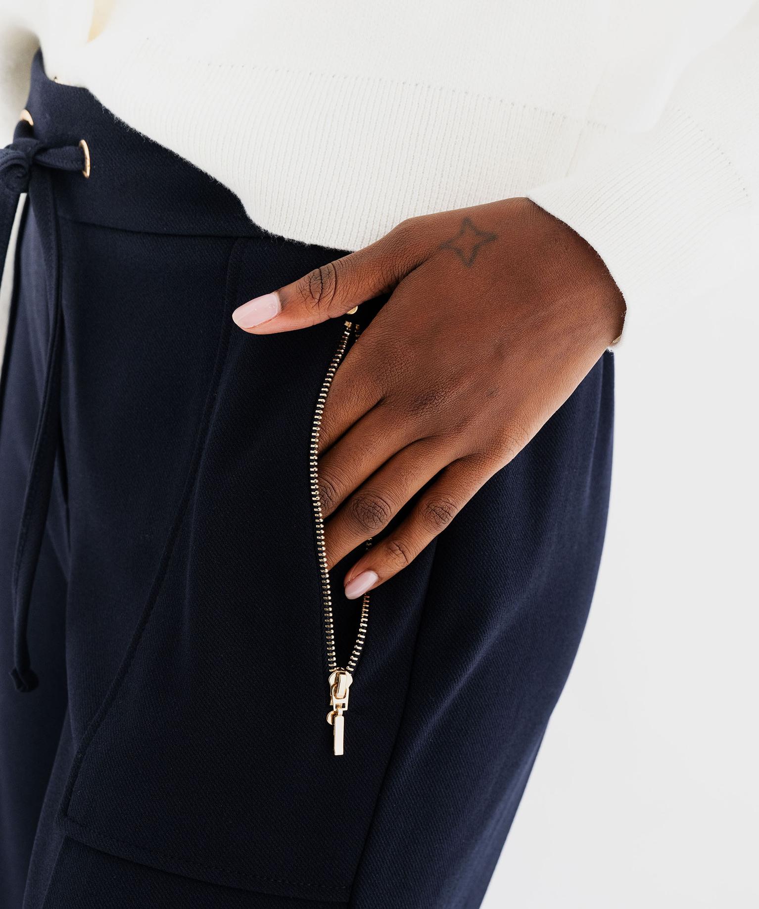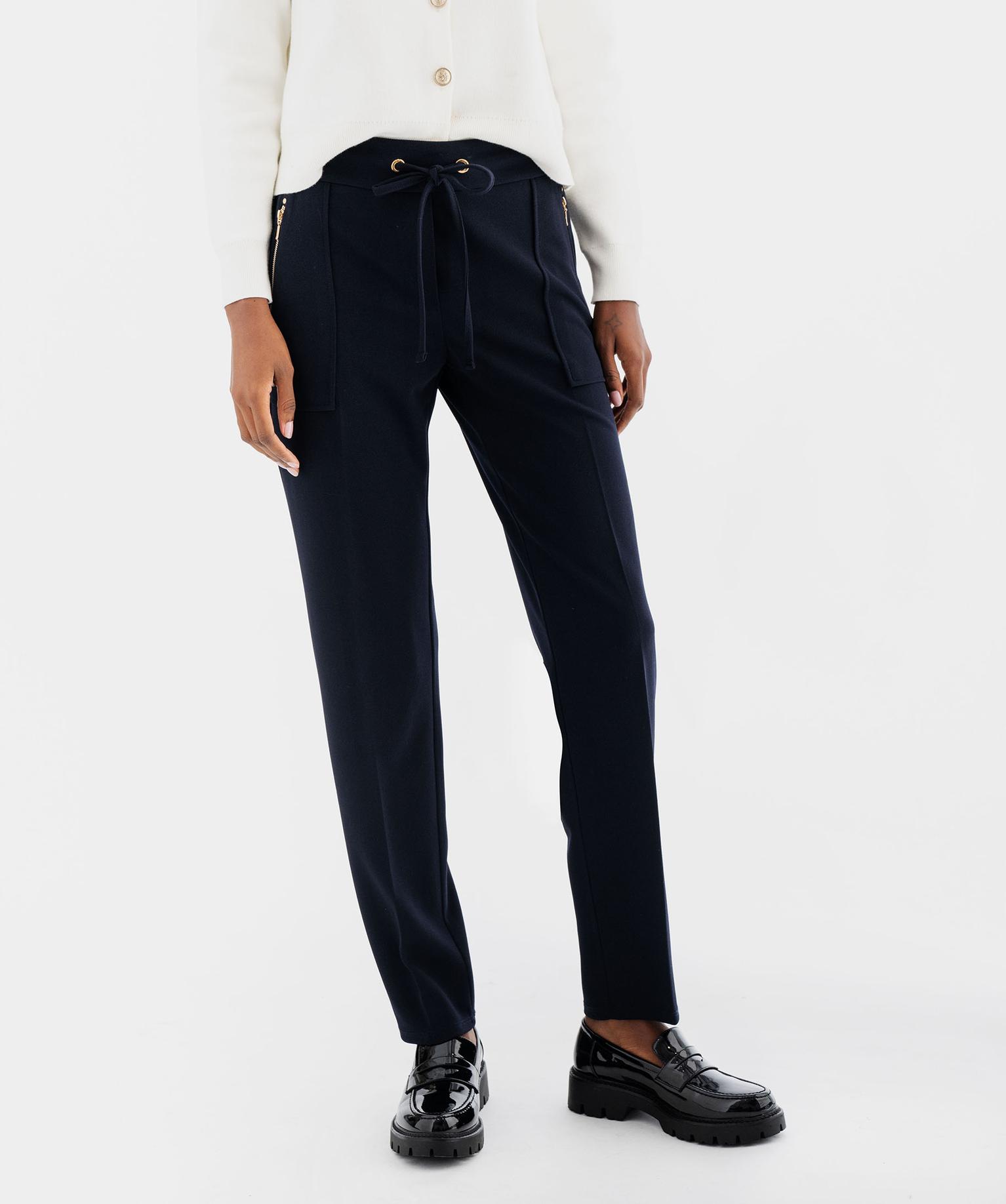 Découvrez une nouvelle version du pantalon de tailleur ! Ce pantalon pour femme est conçu dans une maille fluide et extensible pour un confort optimal. Sa taille élastiquée au dos et son cordon coulissant devant garantissent un ajustement parfait. Pour des finitions soignées, le pantalon présente une coupe cigarette, des plis marqués sur le milieu de la jambe, 2 poches plaquées zippées, une fausse patte de boutonnage et des détails en métal doré. Idéal avec un top en satin ou un blazer.