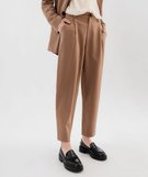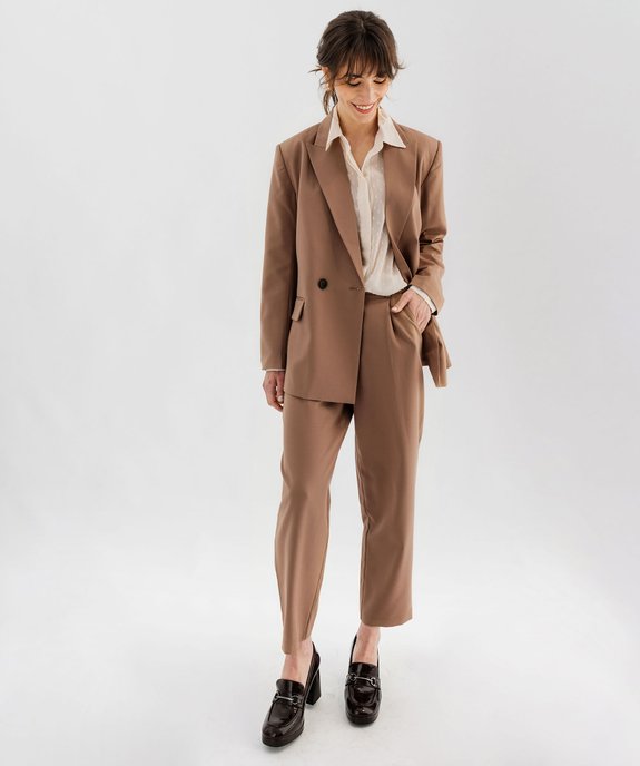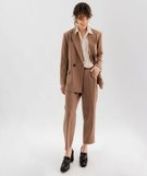 On craque pour la coupe élégante et confortable de ce pantalon carotte 7/8ème. Un pantalon femme confectionné dans une toile fine qui offre une bonne aisance au niveau des hanches et se resserre dans le bas pour sublimer la silhouette. Un pantalon à pinces à porter avec une chemise, la veste assortie et des derbies ou avec un pull col roulé et des boots. Il se ferme par zip et bouton et possède deux poches italiennes et deux fausses poches raglan au dos ornées d’un bouton.