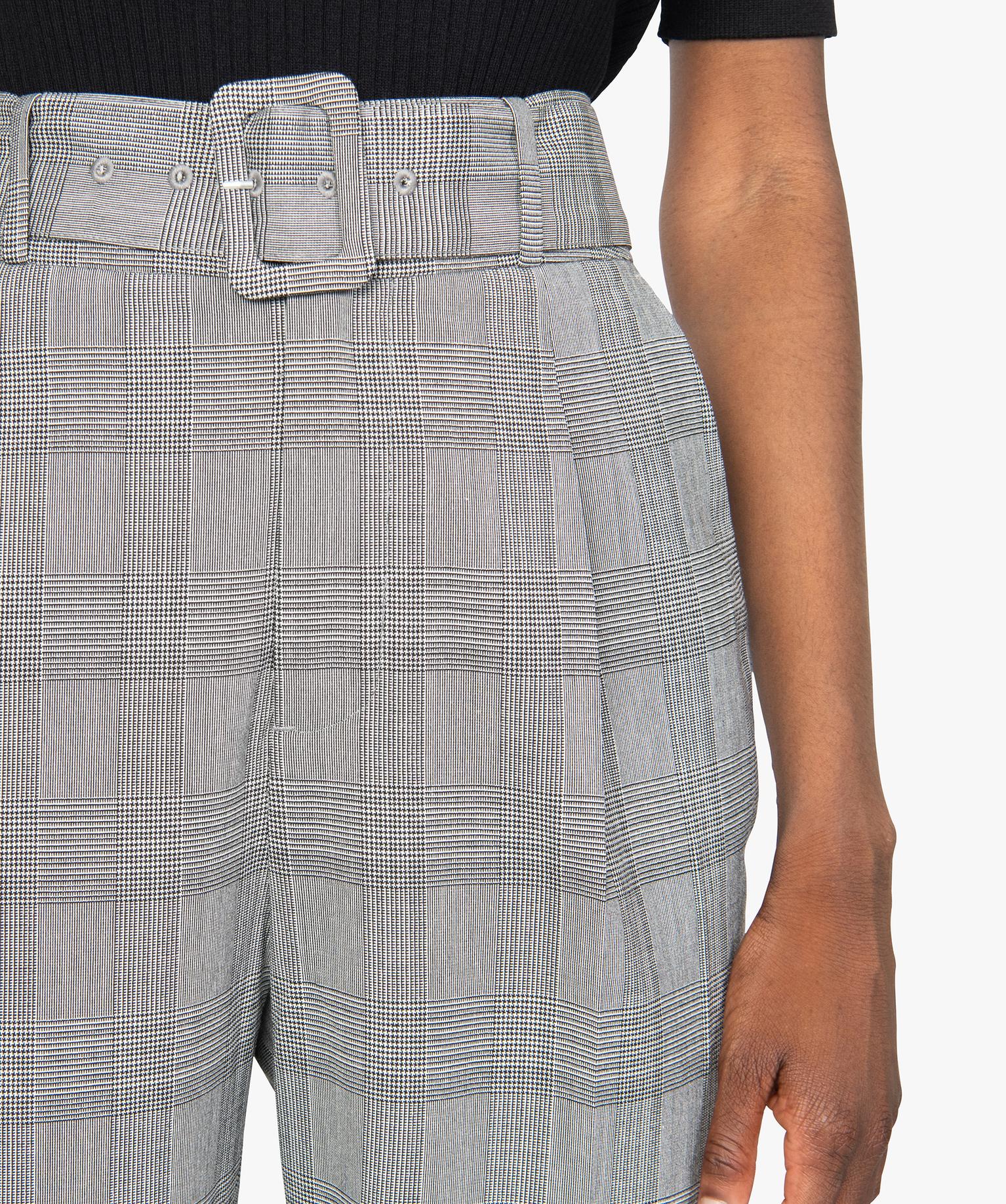 Un pantalon Prince de Galles qui apporte une touche scintillante dans le dressing grâce à ses fils lurex. Un pantalon taille haute qui affiche une coupe large avec pinces et pli sur l’avant. Ce pantalon femme possède une large ceinture assortie avec grosse boucle rectangle. Il se porte avec un pull col roulé, en version chic avec des escarpins ou en version casual avec des baskets. Ce pantalon possède deux poches italiennes et deux fausses poches raglan.
