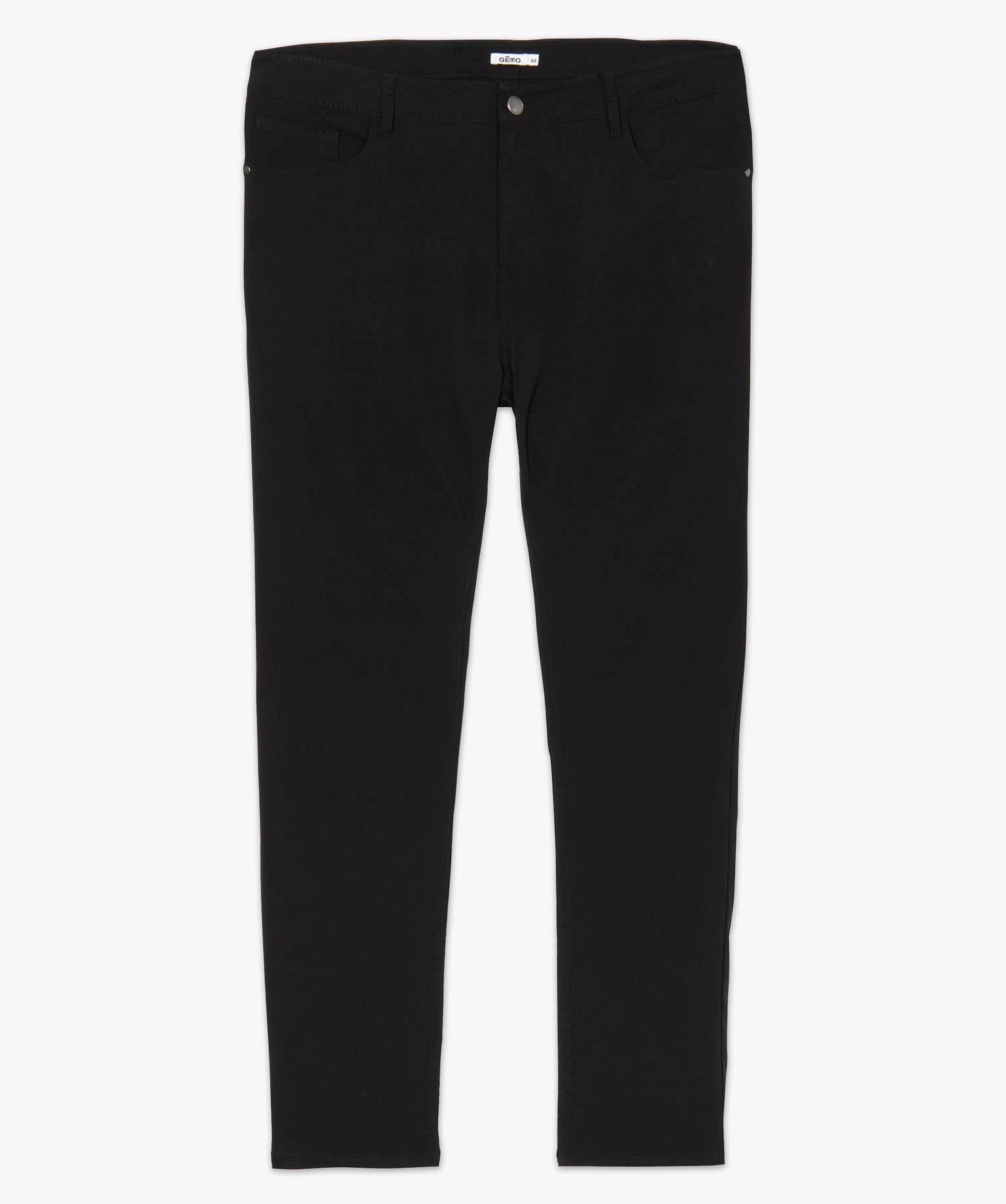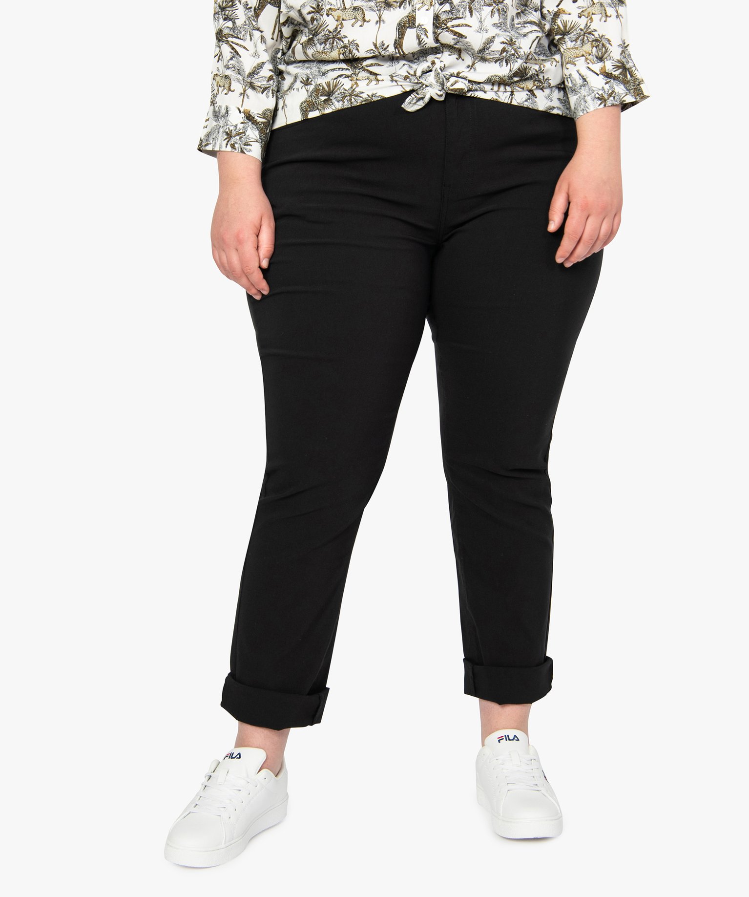 Elégant mix du jean et du pantalon de tailleur : le pantalon 5 poches en toile fine stretch ! Confortable, il vous accompagne aussi bien en journée qu'en soirée. Accessoirisé d'un top en satin et de chaussures à talon, il vous donne une allure habillée très élégante. Doté de finitions jean, ce pantalon pour femme grande taille (du 46 au 54) vous confère une allure casual si vous le portez avec des tennis et un sweat. Confectionné dans une matière très extensible, il offre un maximum de confort.